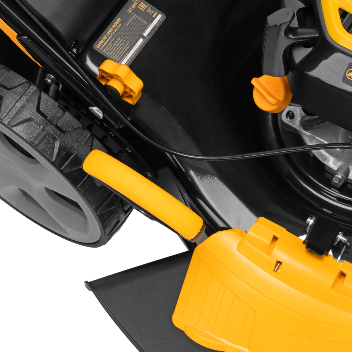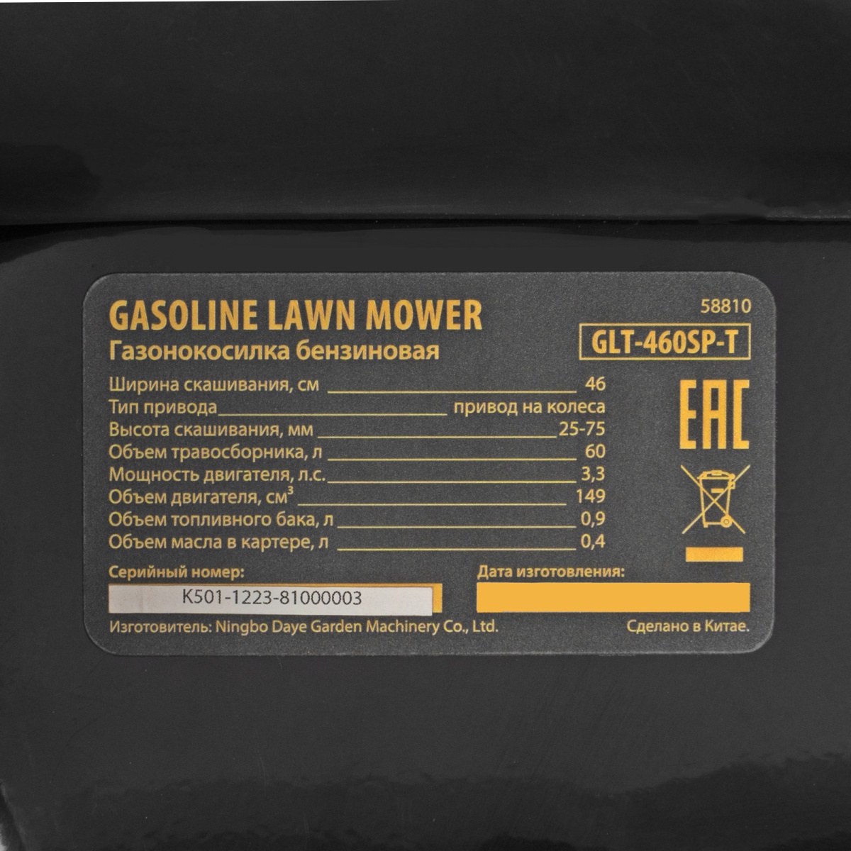Наличие клапана для сброса давления Бензиновая газонокосилка GLT-460SP-T, Trike 149 см3, 46 см, привод, панель, 60л Denzel