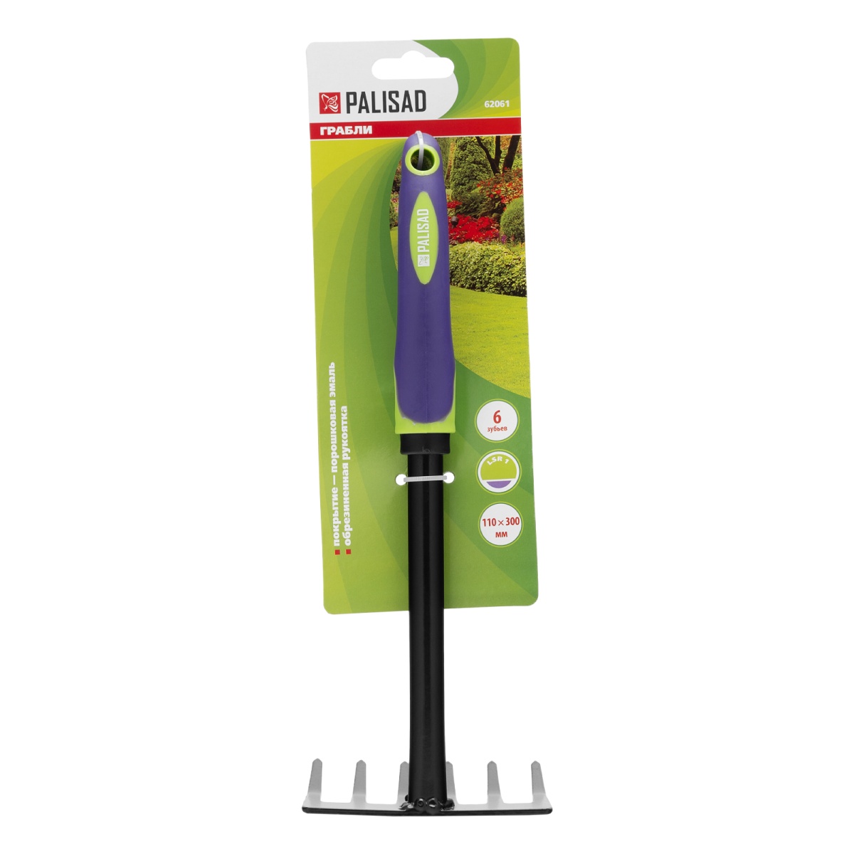 Грабли 6-зубые, 110х300 мм, стальные, обрезиненная эргономичная рукоятка, LSR1, Palisad