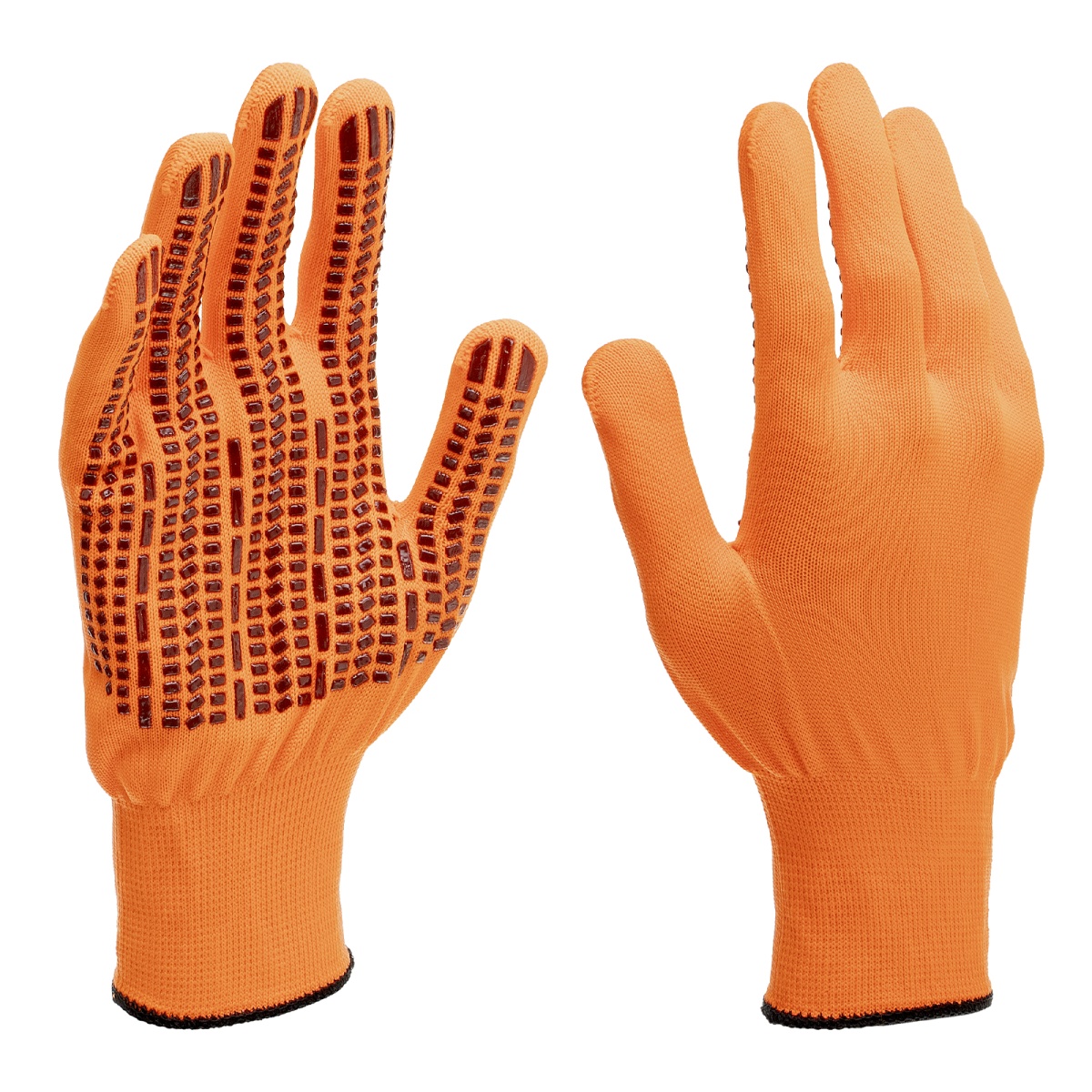 Купить Перчатки трикотажные, синтетическая нить, ПВХ-гель точка, цвет: оранжевый, L, 13 класс Сибртех V5307 по лучшей цене с доставкой - интернет магазин №1 в России