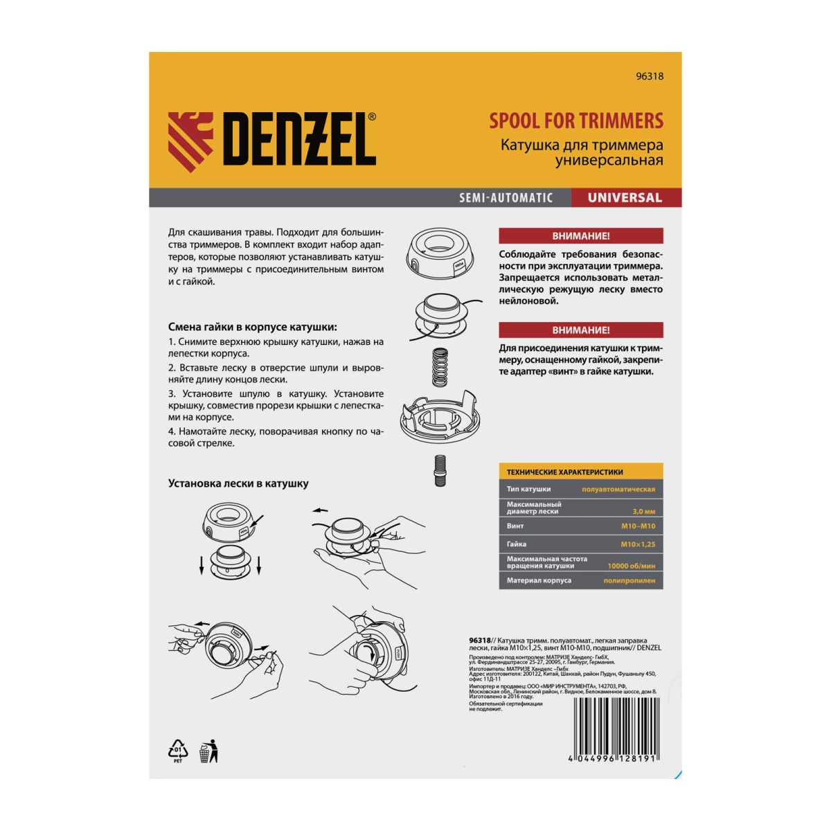 Катушка триммерная полуавтоматическая, легкая заправка лески, гайка M10x1.25, винт M10-M10, подшипник Denzel