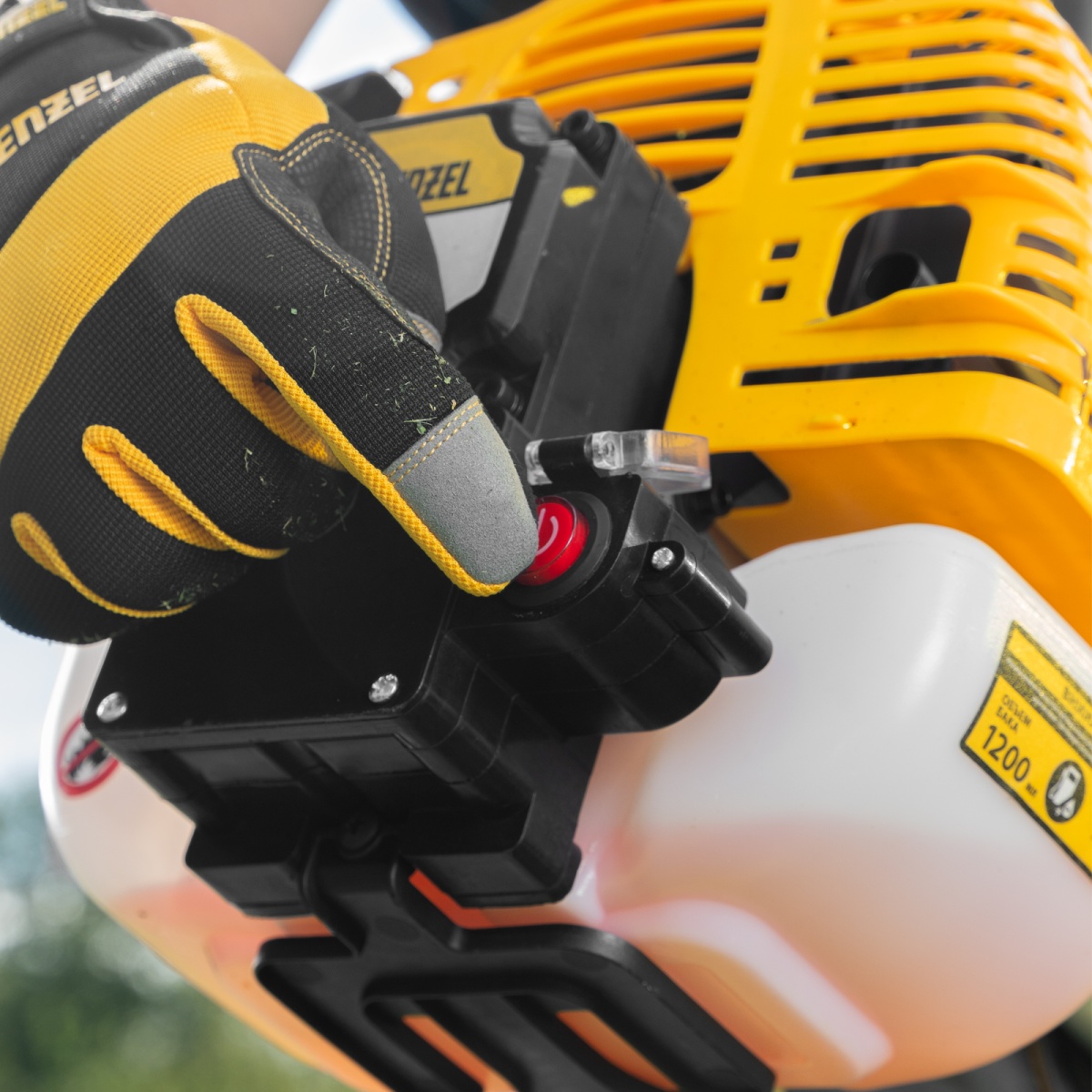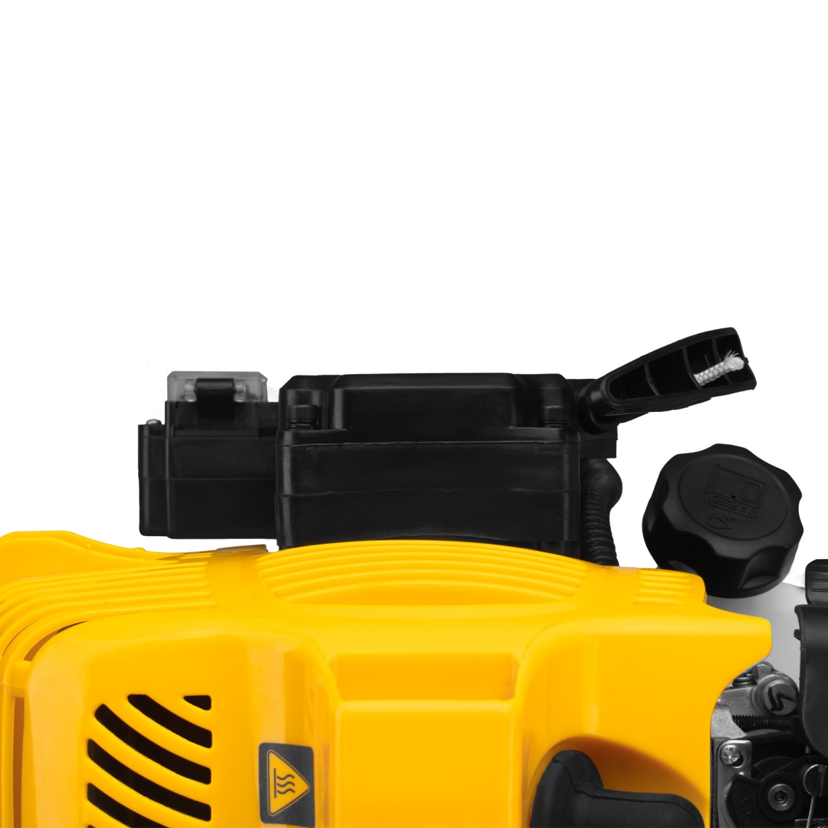 Наличие клапана для сброса давления Триммер бензиновый DT-52E, 52 см3, неразъемная штанга, электростартер, состоит из 2 частей Denzel