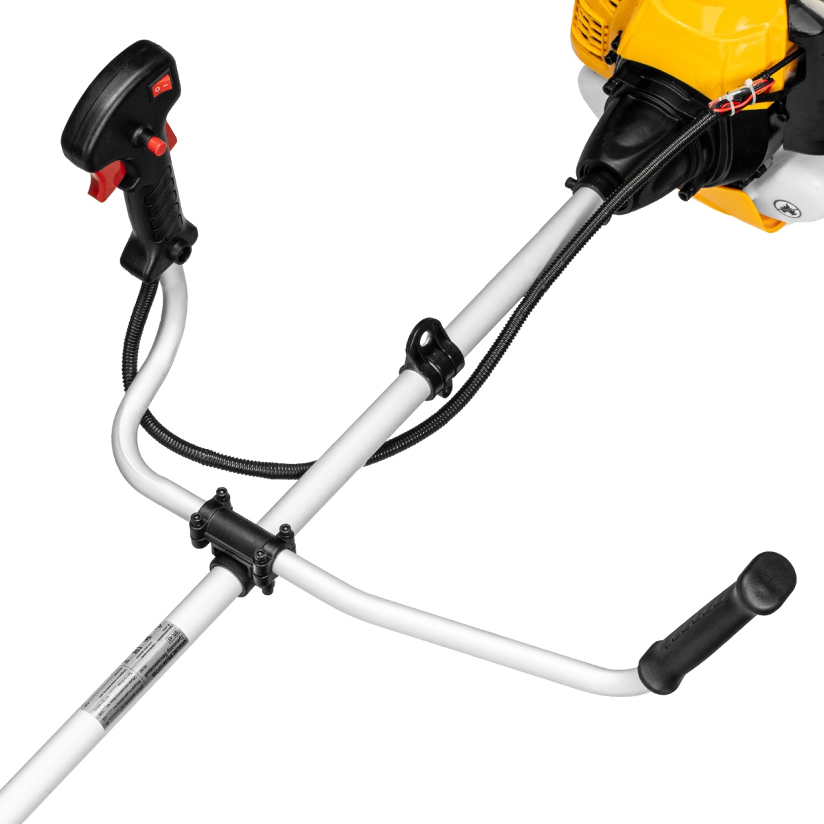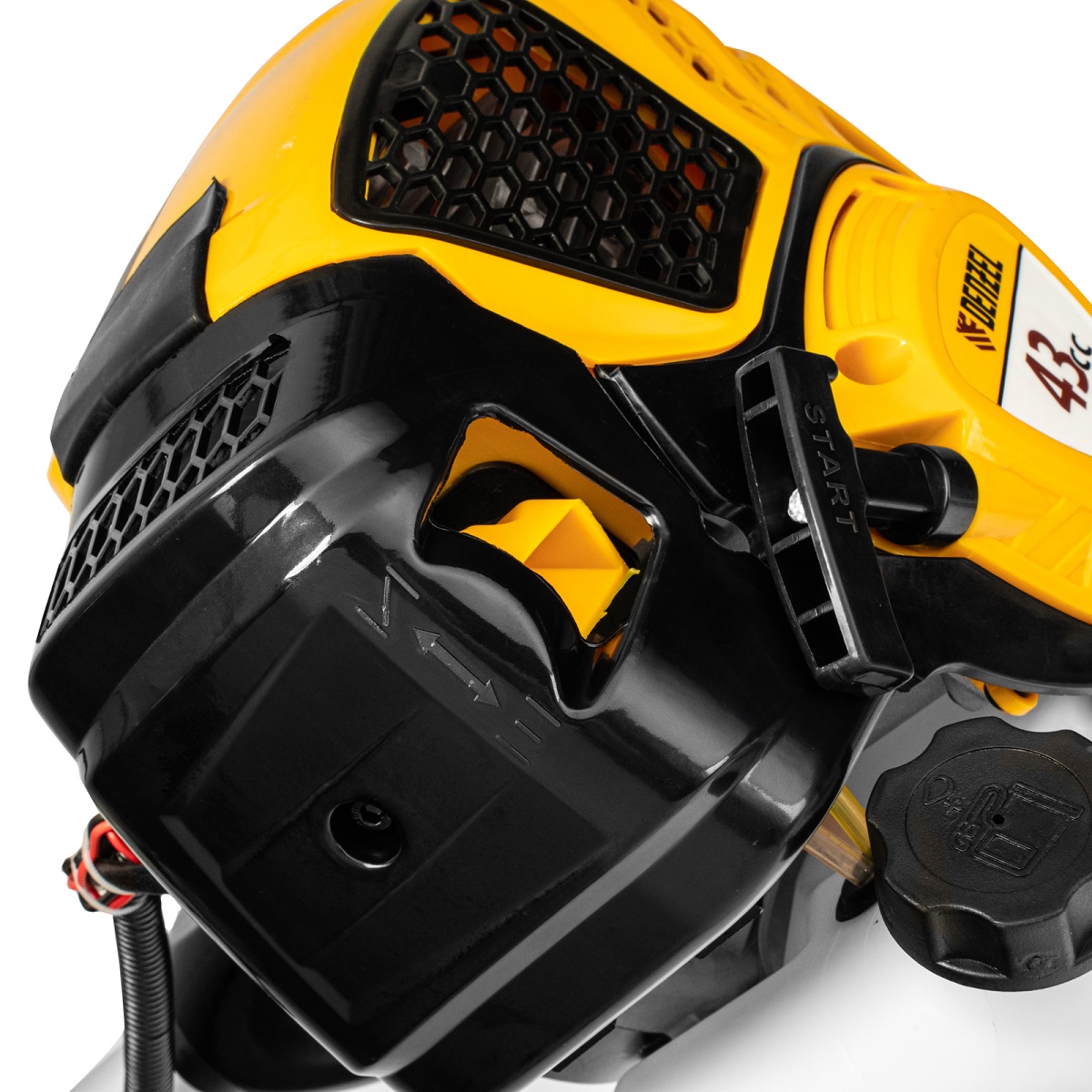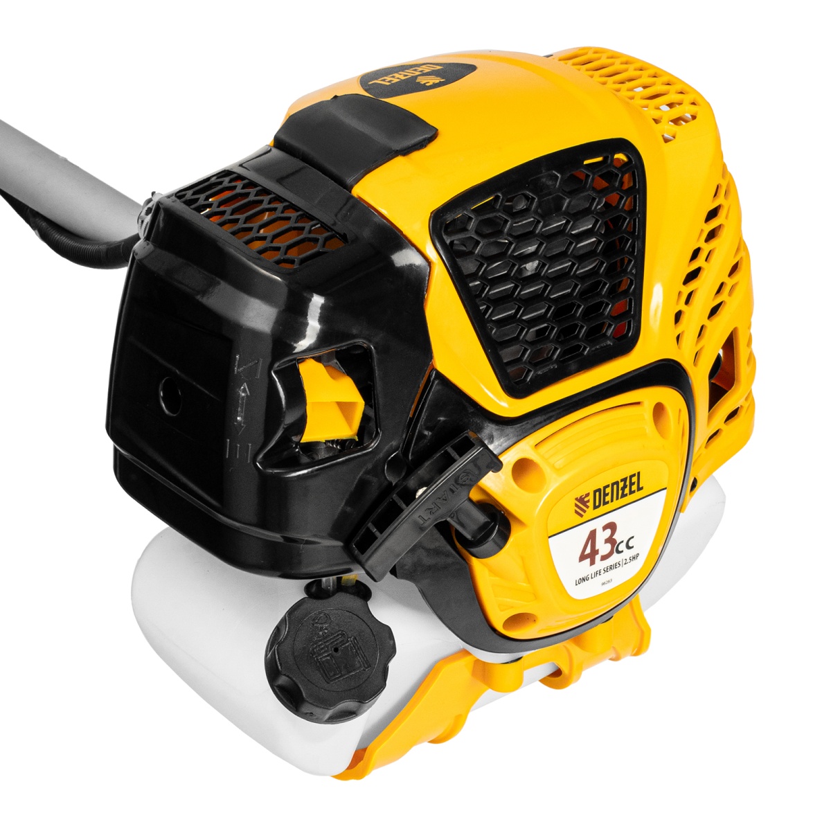 Наличие клапана для сброса давления Триммер бензиновый DTL-43, 43 см3, неразъемная штанга, состоит из 2 частей Denzel