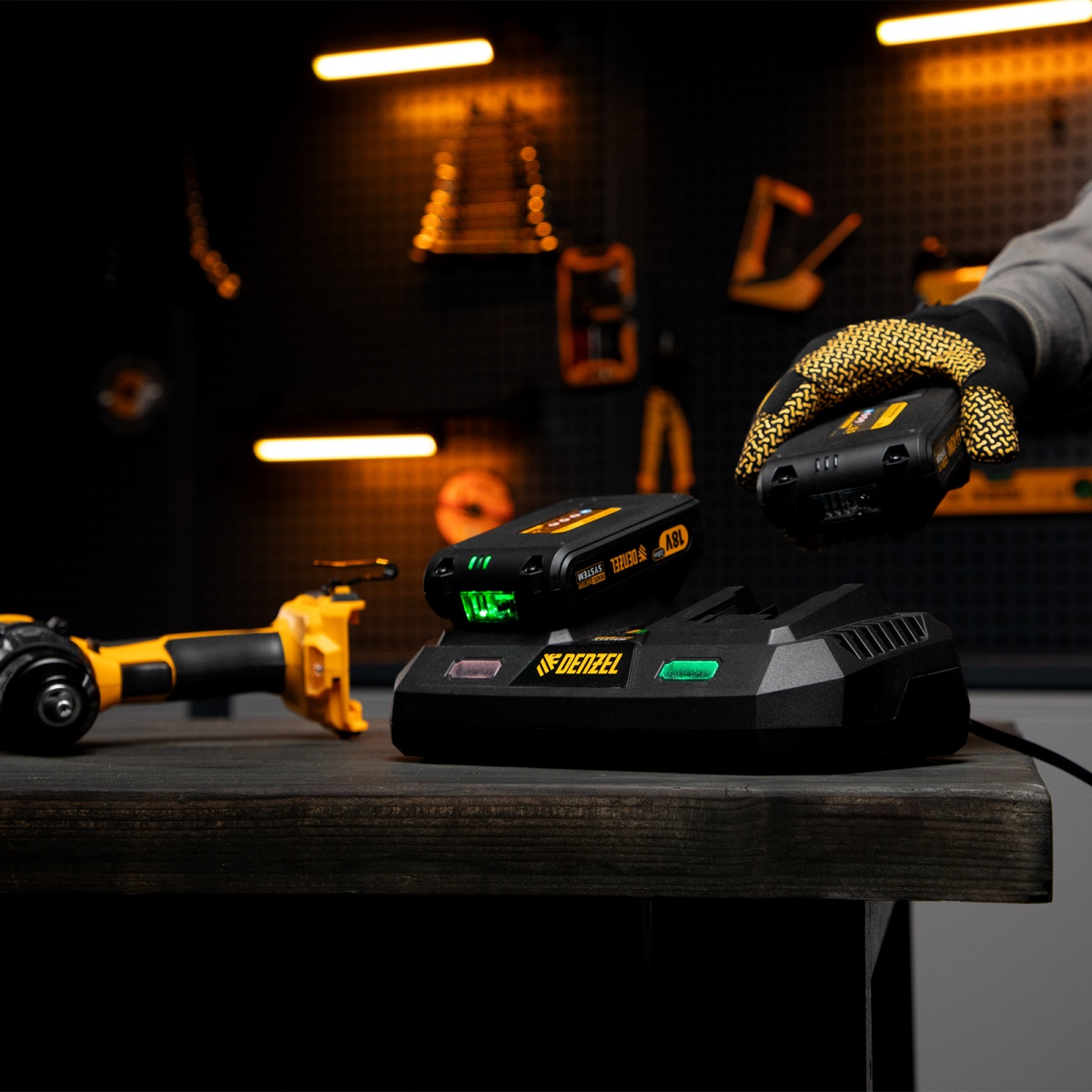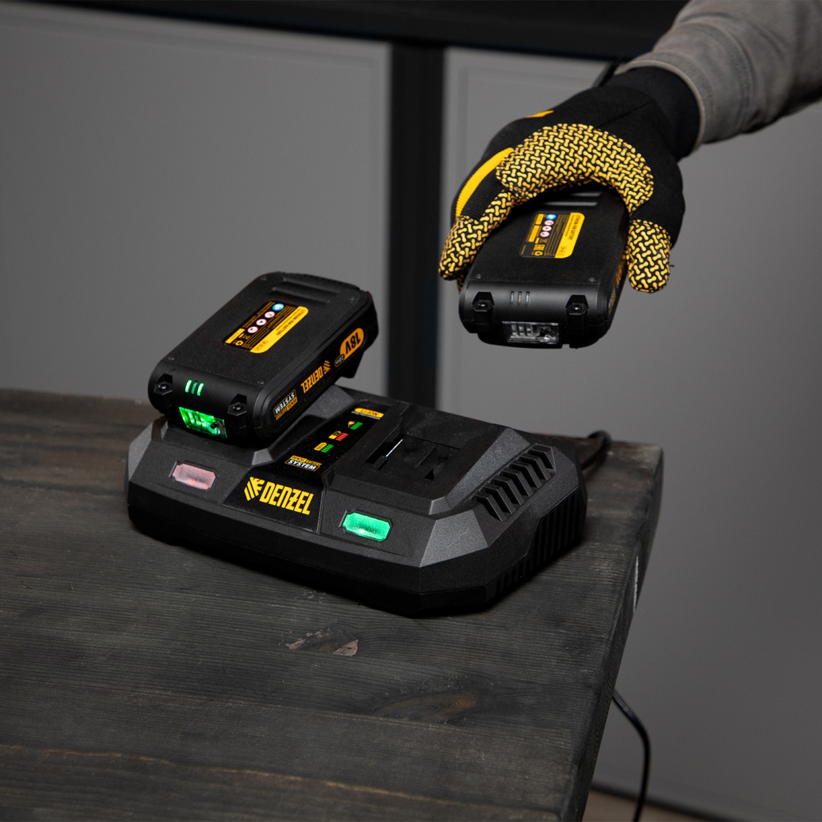 Наличие клапана для сброса давления Устройство зарядное для аккумуляторов IBC-18-3.0-2, Li-Ion, 18В, 3.0 А, для двух батарей Denzel