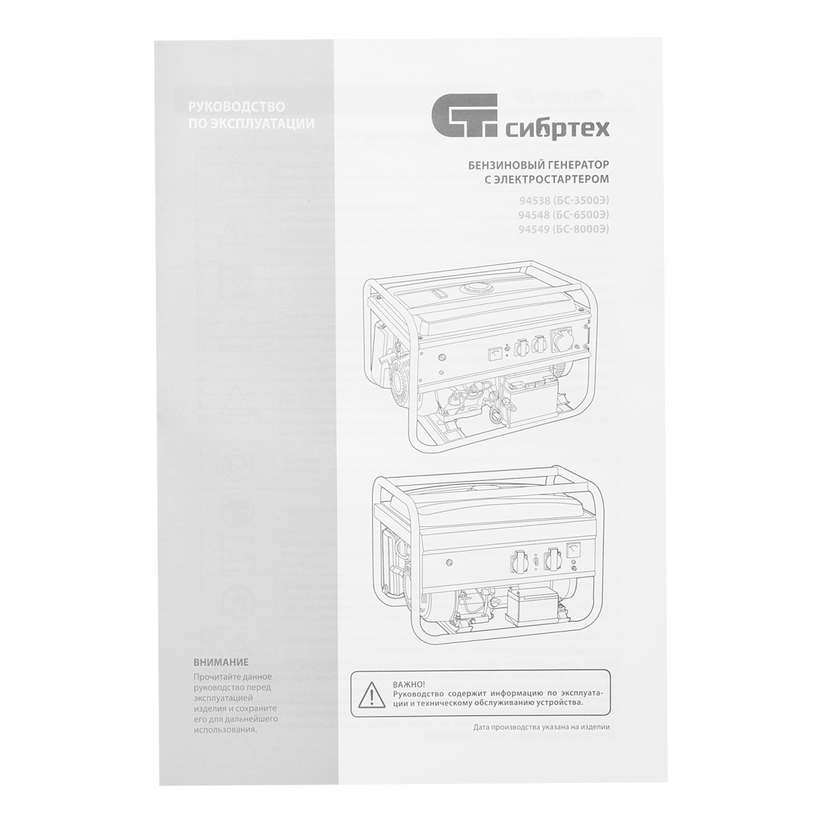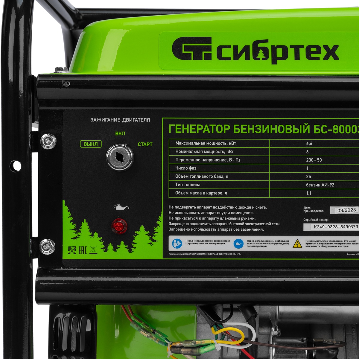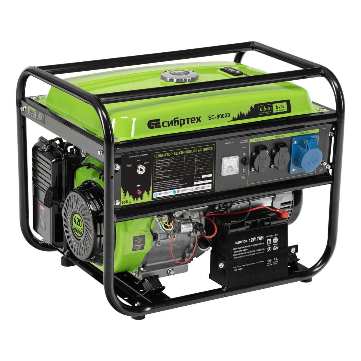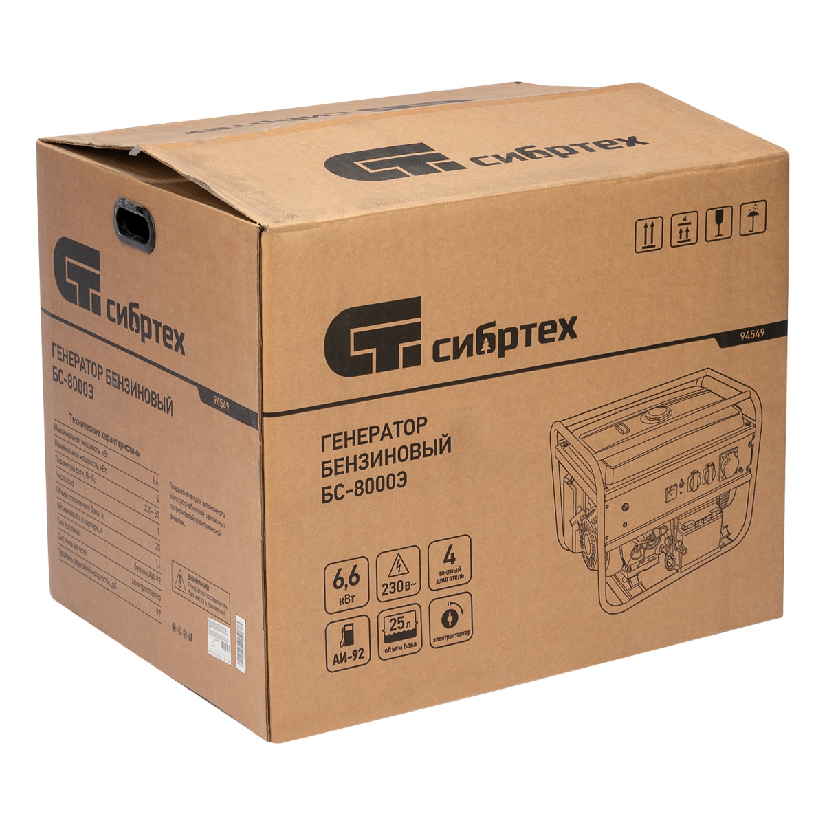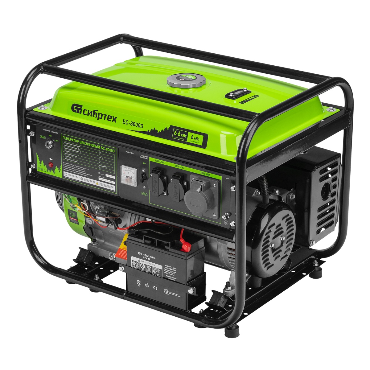 Купить Генератор бензиновый БС-8000Э, 6,6 кВт, 230В, четырехтактный, 25 л, электростартер Сибртех V1325 по лучшей цене с доставкой - интернет магазин №1 в России