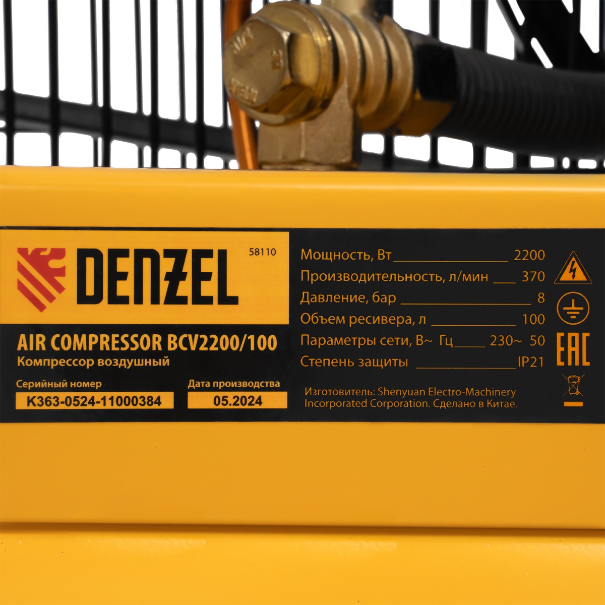 <p>Компрессор Denzel BCV2200/100 58110 мощностью 2,2 кВт и производительностью 370 л/мин, с ресивером на 100 литров, предназначен для работ в мастерских, автосервисах, на производствах или в быту. К нему можно подключать сразу 2 пневмоинструмента, например, дрель, долото, заклепочный или продувочный пистолет, краскопульт, очиститель окалины и пр.,Высокий ресурс чугунных цилиндров, надежная ременная передача и объемный ресивер на 100 л позволяют использовать компрессор длительное время. При необходимости можно напрямую подключать второй накопитель или пневмомагистраль через дополнительный порт.</p><h2>Преимущества</h2><ul><li>Тепловая защита — температура обмоток двигателя контролируется и в случае превышения допустимой нормы работа прекращается, чтобы устройство охладилось.</li><li>Защита от перегрузки — если сила тока превышает безопасный порог, мотор моментально отключается, поэтому он остается в сохранности даже в случае резко возрастающей нагрузки.</li><li>Автоматизация работы — реле FBANG самостоятельно останавливает и повторно запускает двигатель для поддержания давления в диапазоне 6,5-8 бар.</li><li>Защита от аварийных ситуаций — если реле давления по каким-то причинам не остановит работу при превышении допустимого давления, лишний воздух стравится через предохранительный клапан.</li><li>Удобный контроль работы — 2 манометра позволяют без труда отслеживать уровень давления как в ресивере, так и на выходной магистрали.</li><li>Высокое качество ресивера — толщина стенок более 2 мм, прочное сварное соединение и антикоррозийное покрытие надежно защищают его от внутренних разрушений.</li><li>Надежный картер — детали прочно прилегают друг к другу, а крышка плотно закрывается, что обеспечивает полную защиту от протекания масла.</li><li>Смотровое окно — уровень масла в картере удобно отслеживать, это позволяет вовремя доливать его и избегать поломок двигателя.</li><li>Коррозионностойкая клапанная плита — гальваническое покрытие предотвращает разрушение стали, это по |