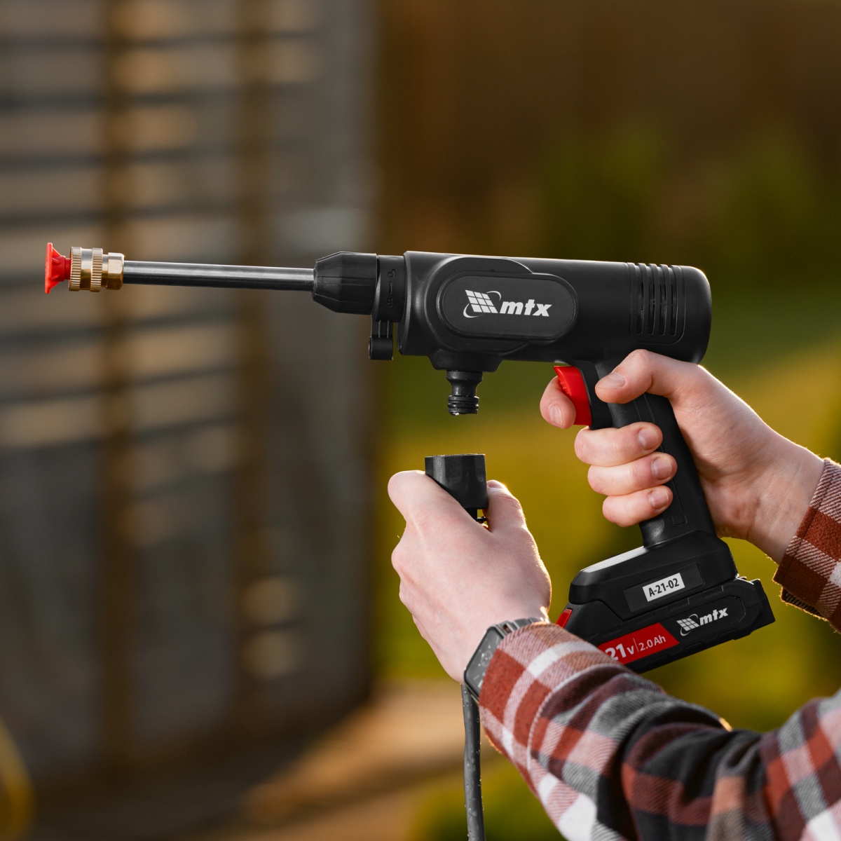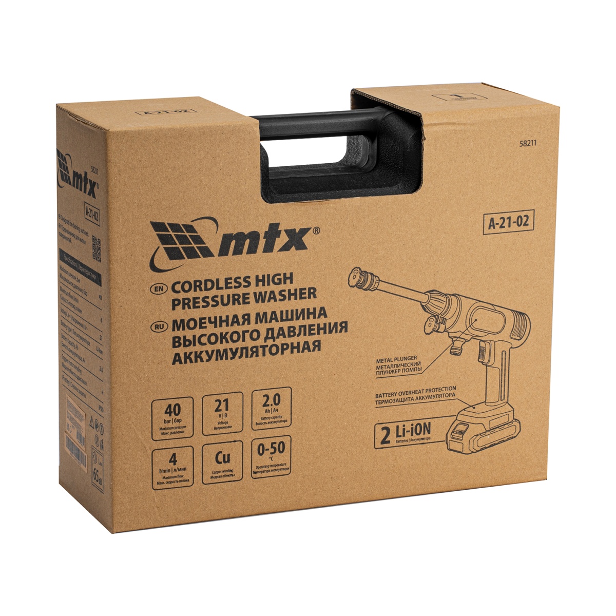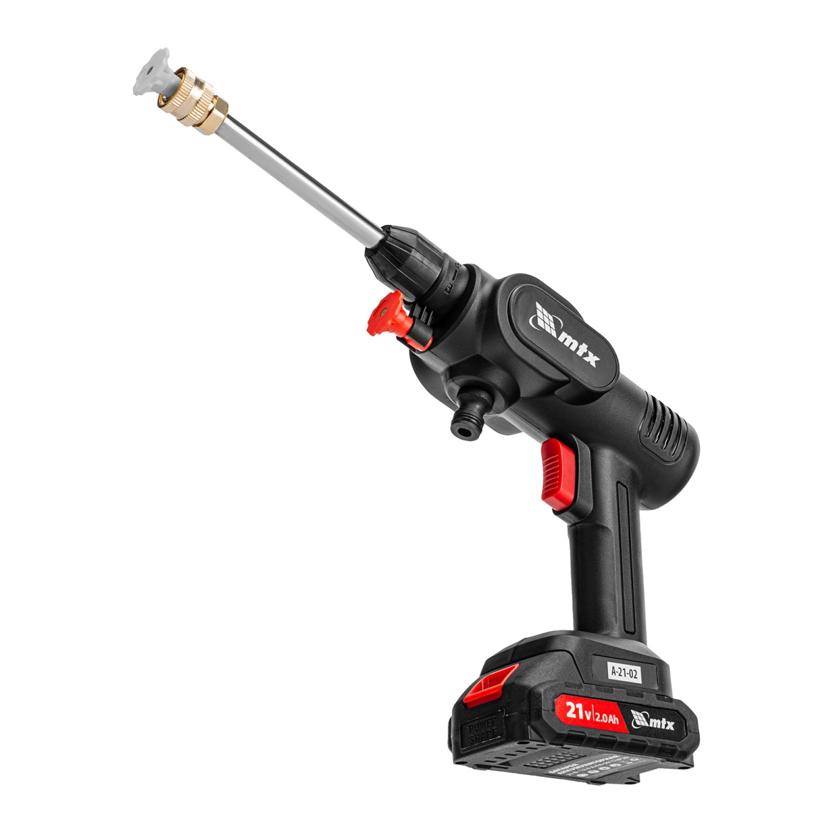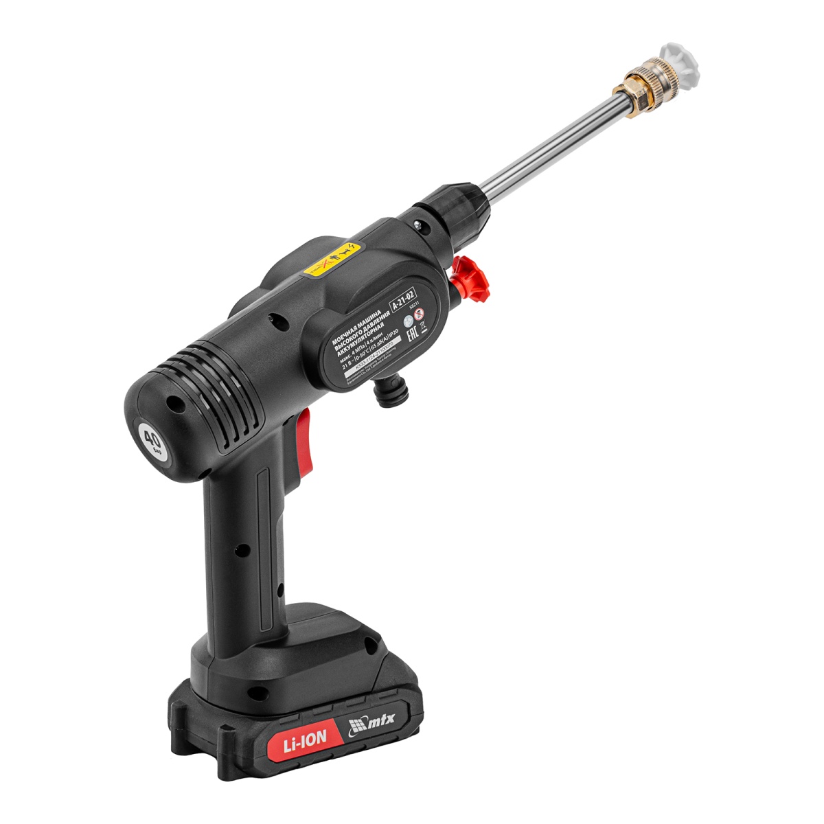 Моечная машина высокого давления аккумуляторная А-21-02, 40 бар, 4 л/мин, Li-ion 21 В, 2 акк. MTX