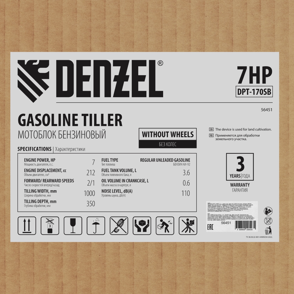 Купить Мотоблок DPT-170SB, 7 л.с., ремен.сцеп, фрез 3х4, ШОМ, без колес, передачи 2В/1Н Denzel V4120 по лучшей цене с доставкой - интернет магазин №1 в России