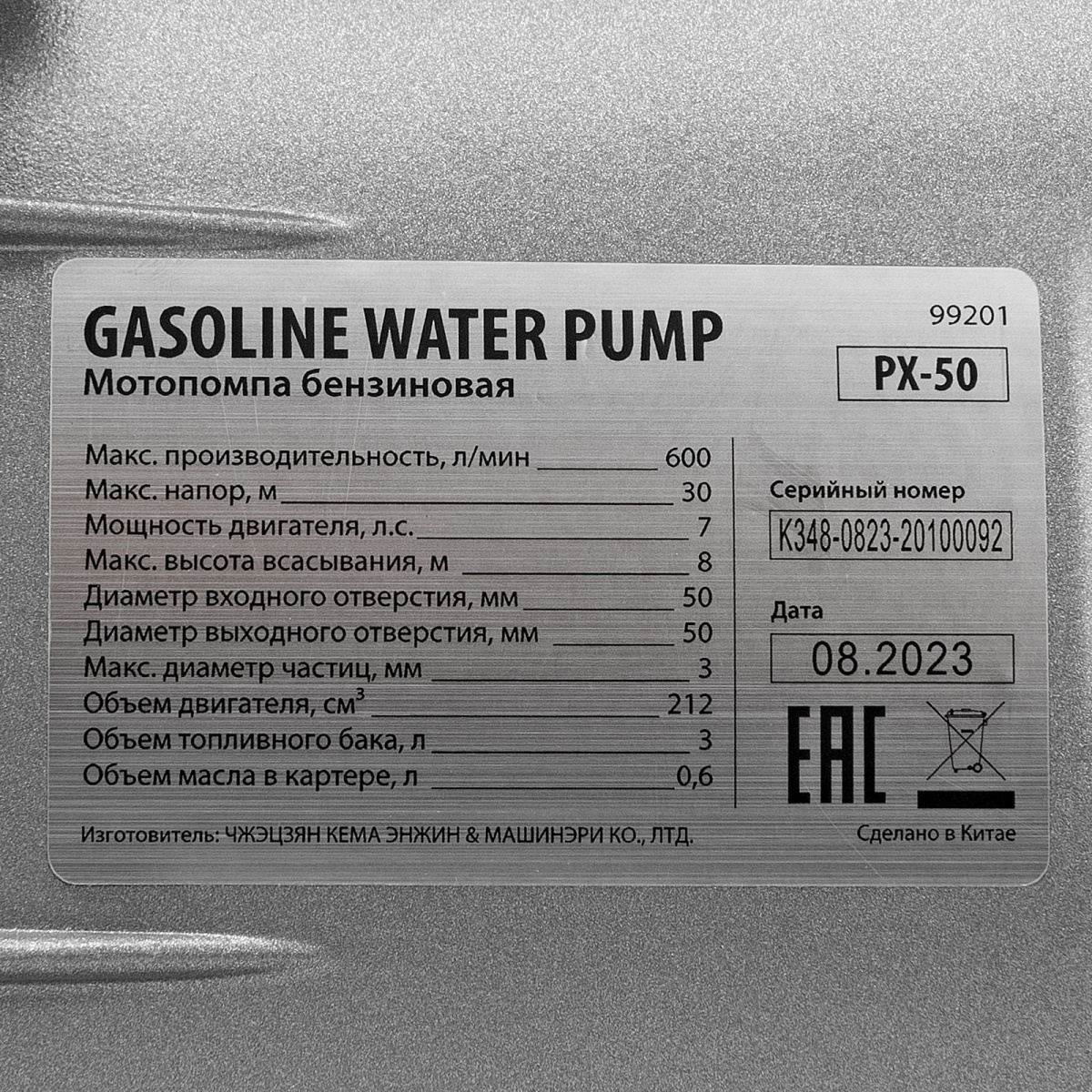 Мотопомпа бензиновая для чистой воды PX-50, 7 л.с, 2", 600 л/мин, глубина 8 м, напор 30 м Denzel