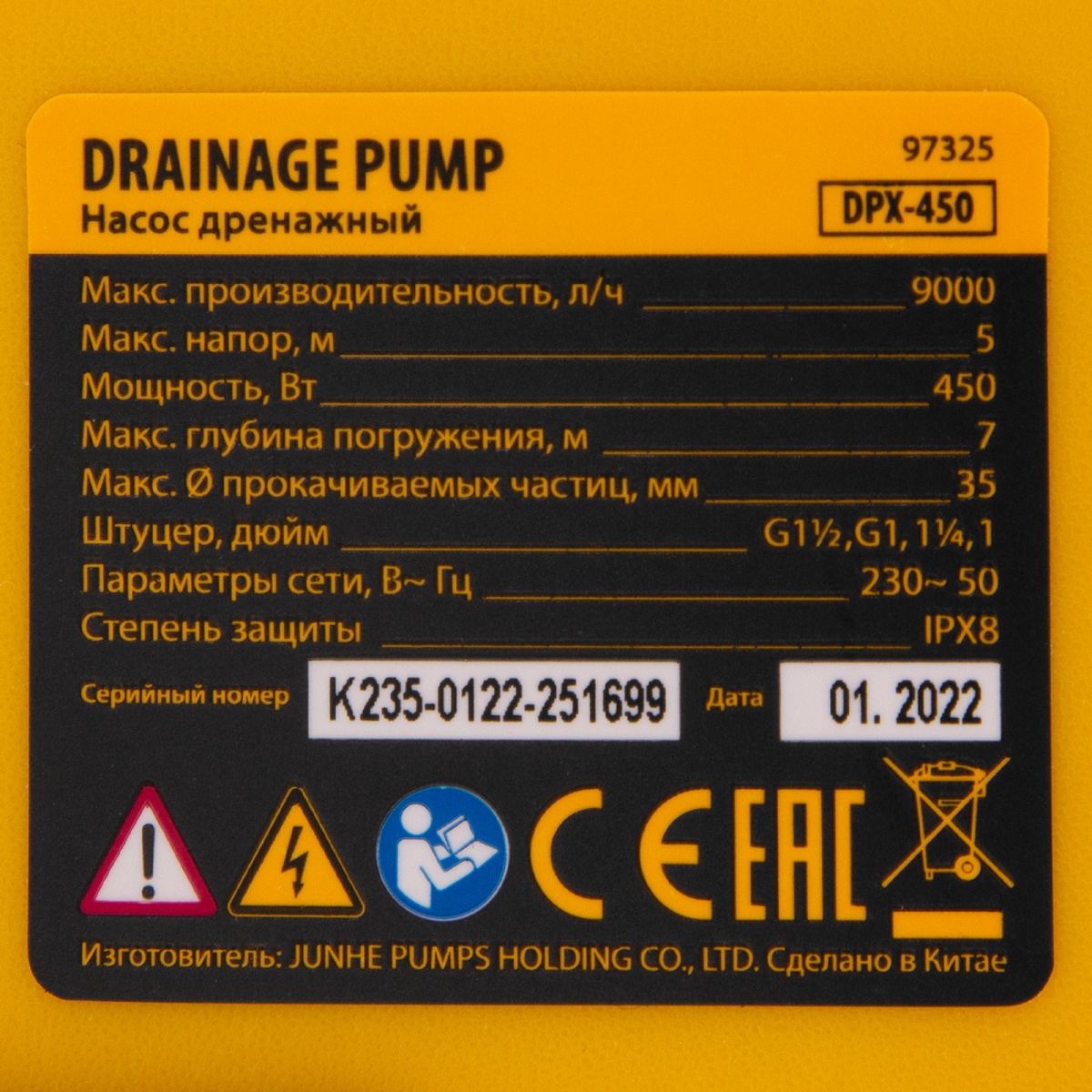 Наличие клапана для сброса давления Дренажный насос DPХ450, 450 Вт, подъем 5 м, 9000 л/ч Denzel