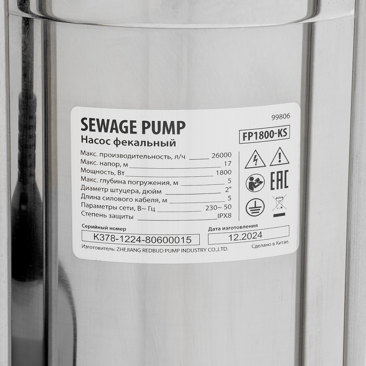 Наличие клапана для сброса давления Фекальный насос FP1800-KS, 1800 Вт, напор 17 м, 26000 л/ч, нож-измельчитель Denzel