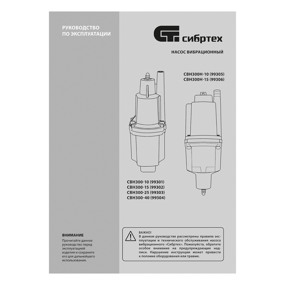 Вибрационный насос СВН300Н-15, нижний забор, 300 Вт, напор 75 м, 1200 л/ч, кабель 15 м Сибртех