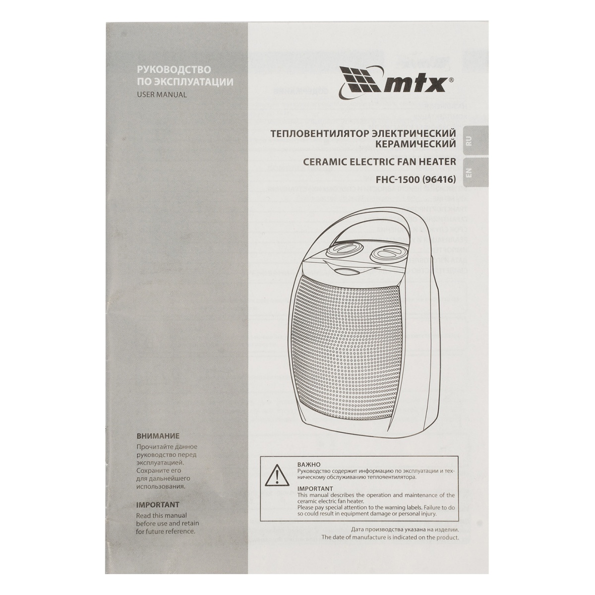Наличие клапана для сброса давления Тепловентилятор электр. керамический FHC-1500, 3 реж., вентилятор, нагрев 750/1500 Вт, MTX
