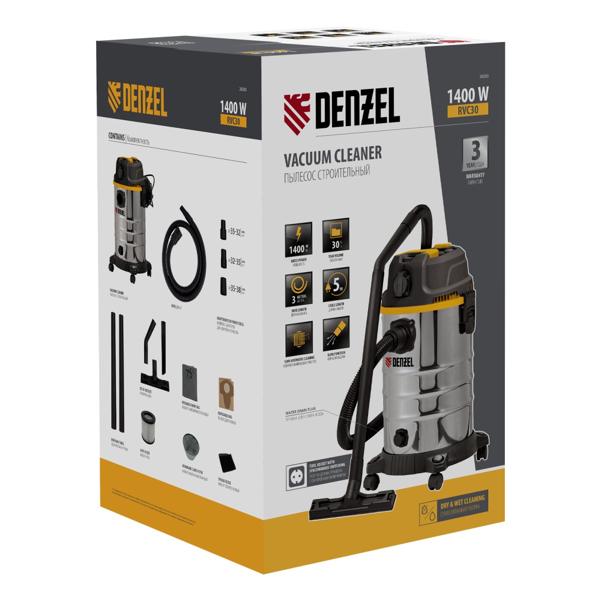 Купить Пылесос строительный RVC30, 1400 Вт, бак 30 л, шланг 3 м, розетка с автосинхр. Denzel V5904 по лучшей цене с доставкой - интернет магазин №1 в России