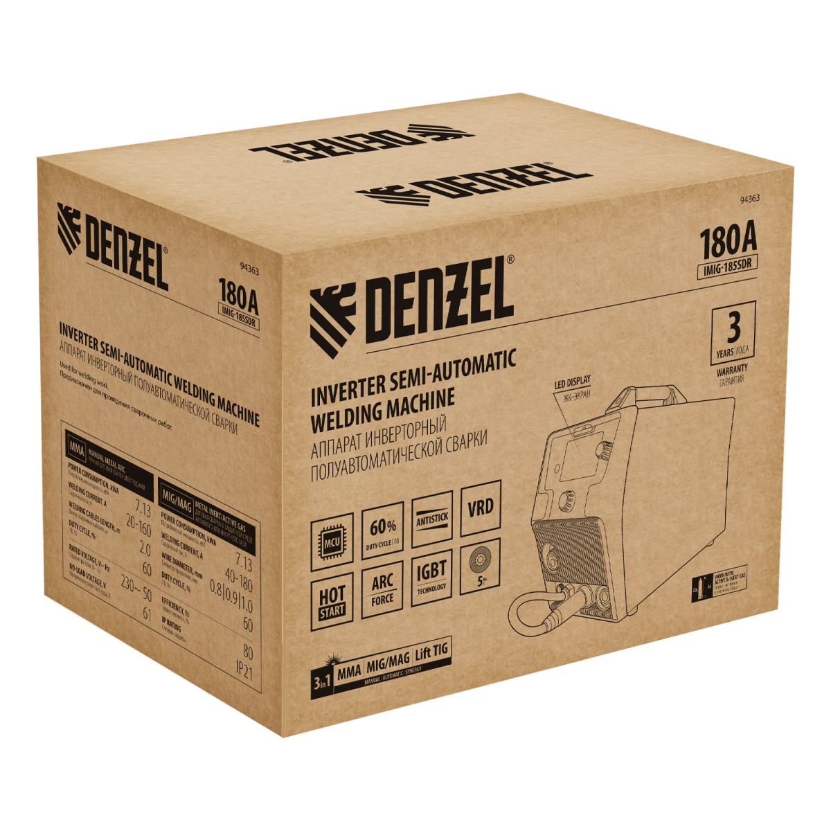 Купить Аппарат инвертор. полуавтомат. cварки IMIG-185SDR, 180 А, ПВ 60%, катушка 5 кг Denzel V471 по лучшей цене с доставкой - интернет магазин №1 в России