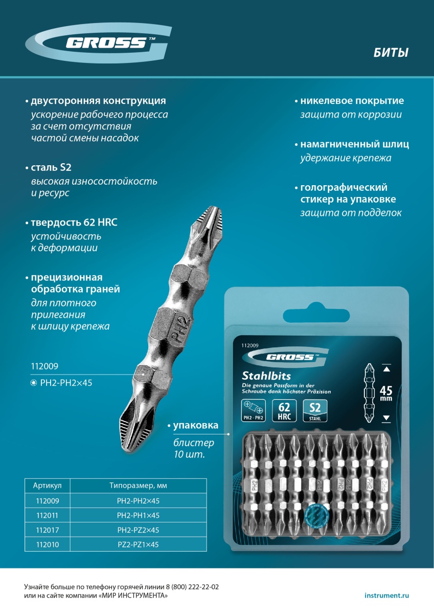 Наличие клапана для сброса давления Бита двухстор., PZ2-PZ1х45мм, сталь S2, 10шт. Gross