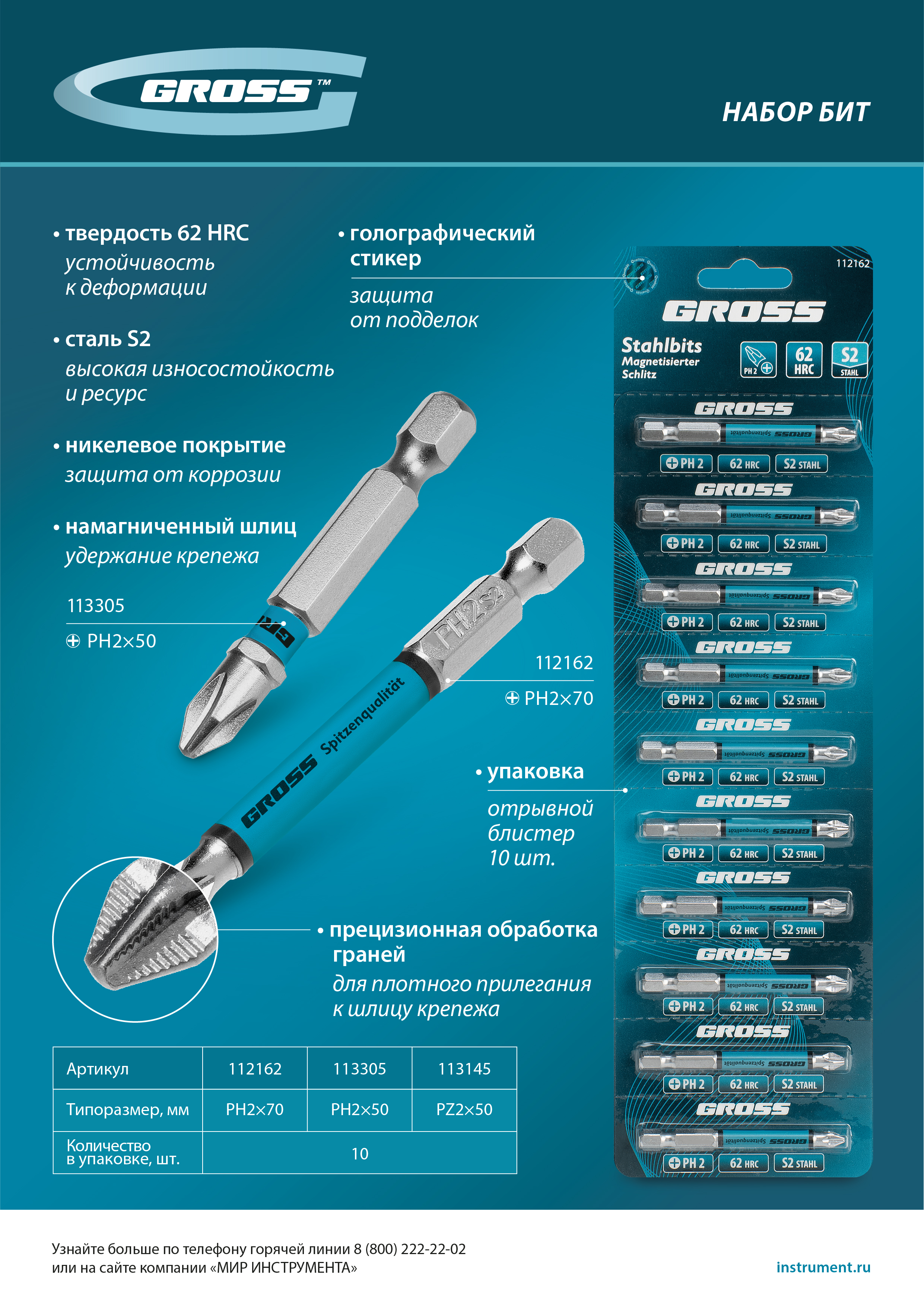 Купить Бита PZ2х50мм, сталь S2, шестигр., отрывн., 10 шт. Gross V570 по лучшей цене с доставкой - интернет магазин №1 в России