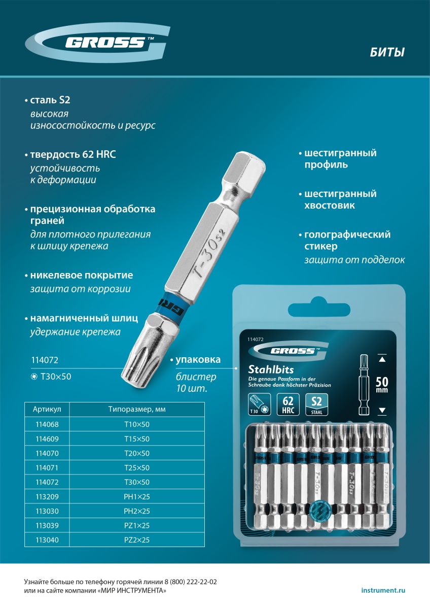 Бита Torx 15х50мм, сталь S2, шестигр., 10 шт. Gross