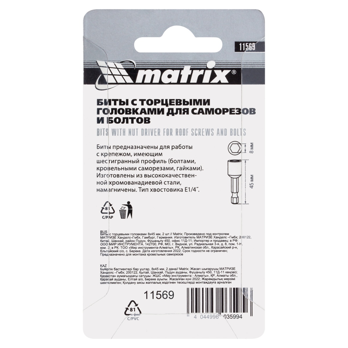 Биты с торцевыми головками 8 мм, 45 мм, 2 шт. Matrix