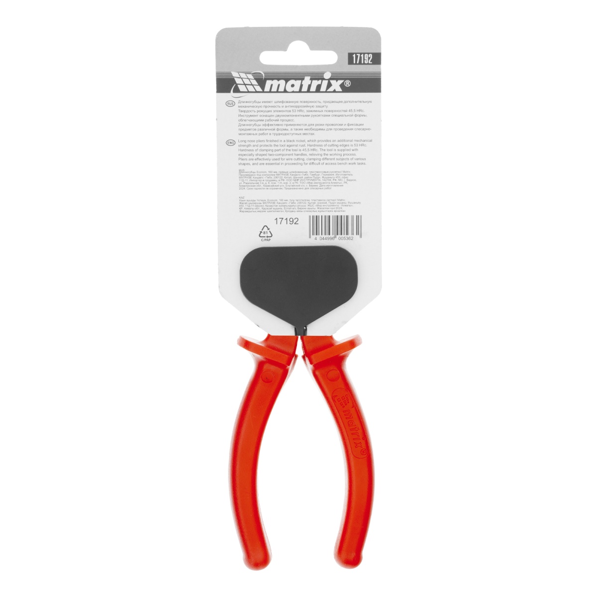Длинногубцы прямые Econom, 160 мм, шлифованные, пластмассовые рукоятки Matrix