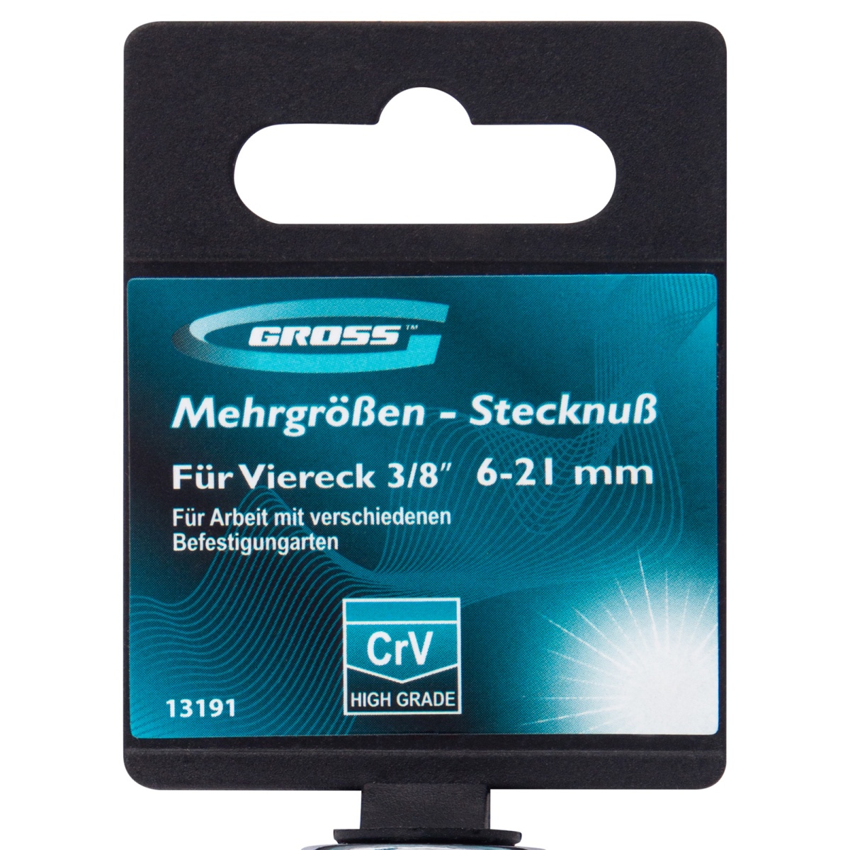 Головка торцевая многоразмерная, CrV, 6-21 мм, под квадрат 3/8, CrV, хромированная Gross