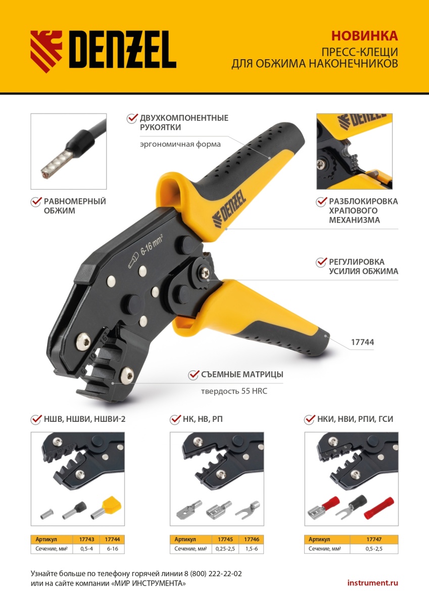 Наличие клапана для сброса давления Клещи для обжима наконечников штыревых НШВ, НШВИ, НШВИ-2, 0,5-4 мм2 Denzel