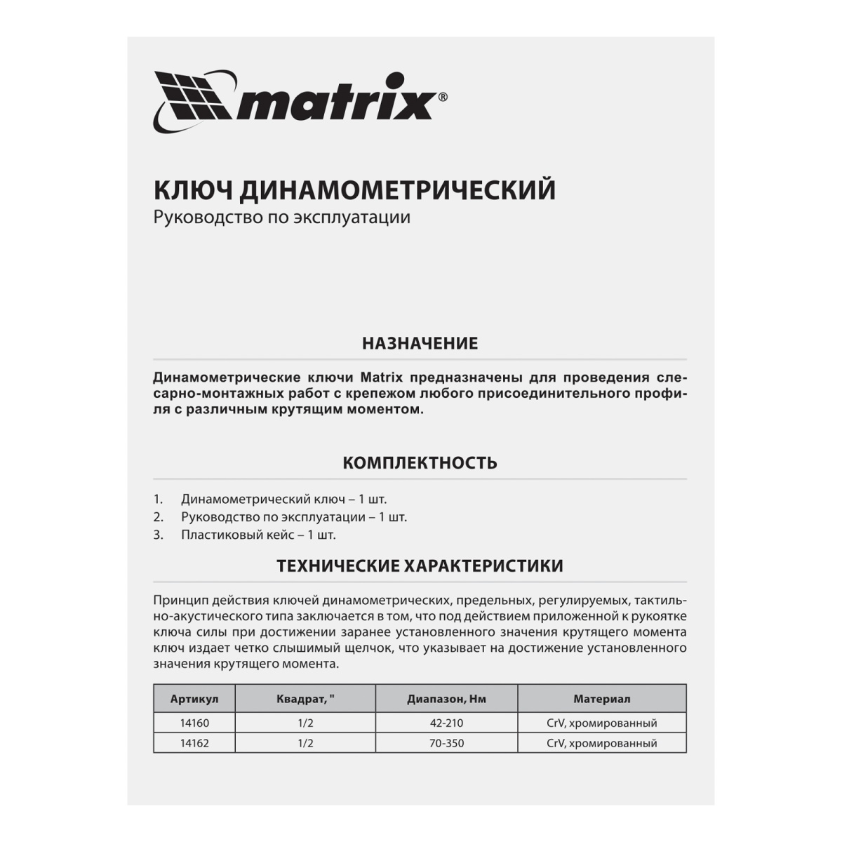 Купить Ключ динамометрический, 70-350 Нм, 1/2, CrV, хромированный Matrix V2289 по лучшей цене с доставкой - интернет магазин №1 в России