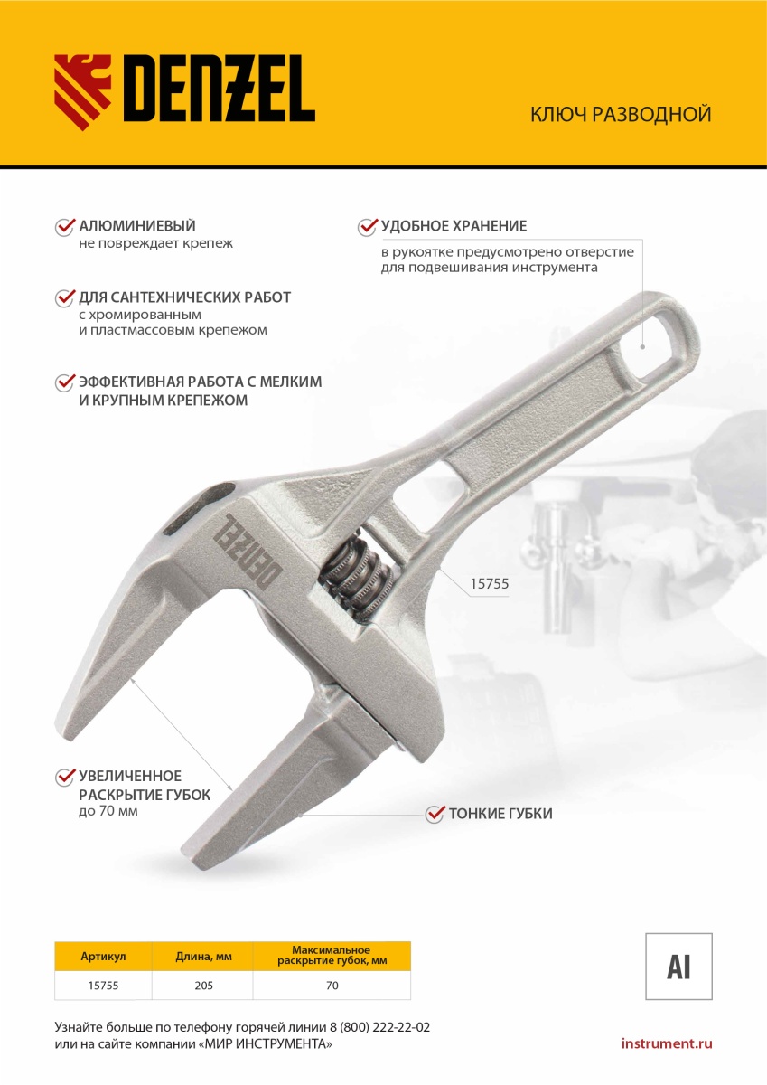 Купить Ключ разводной 205 мм, алюминиевый Denzel V2502 по лучшей цене с доставкой - интернет магазин №1 в России