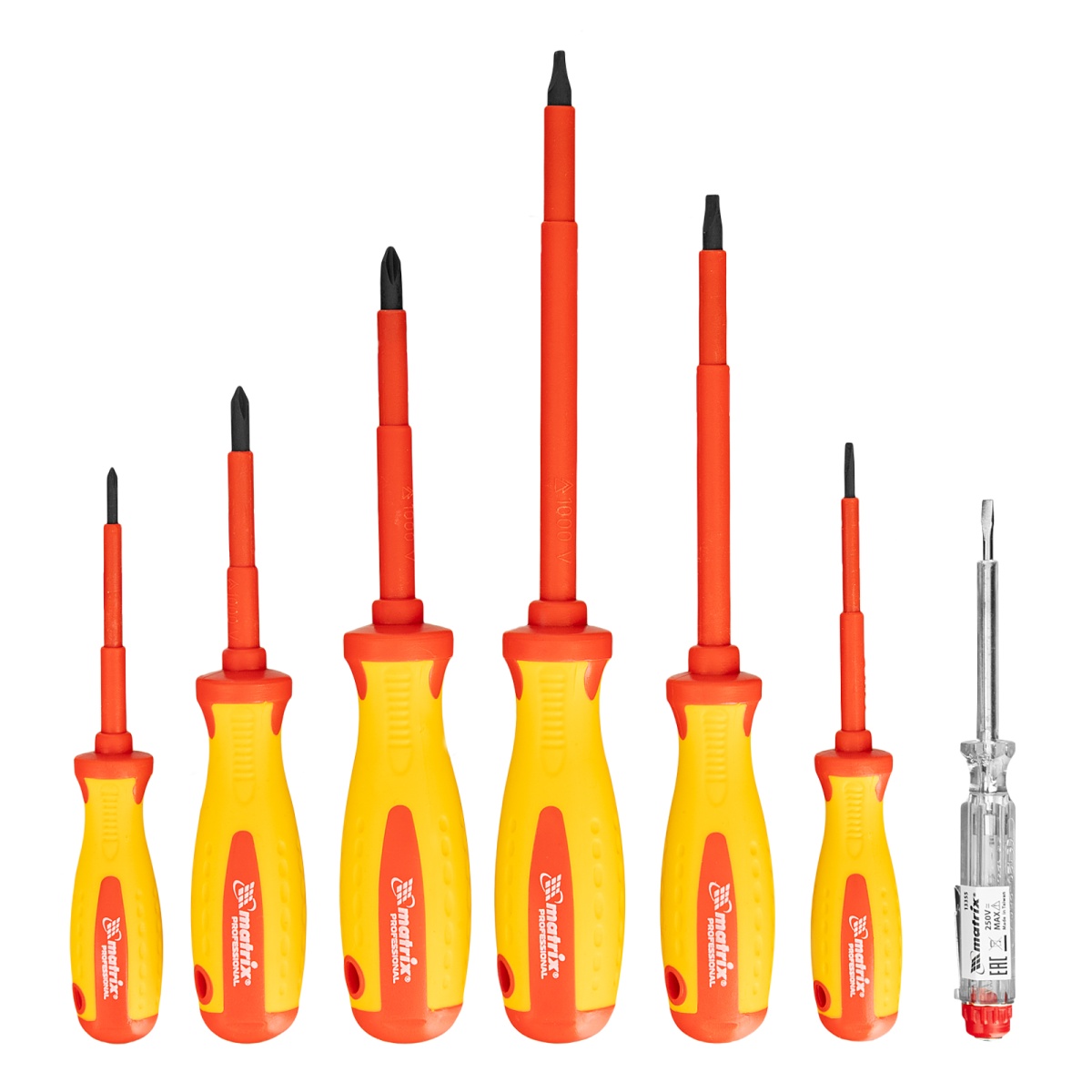 Набор диэлектрических отверток 7 шт, до 1000 В, пробник электрический до 250 В, двухкомпонентные рукоятки Matrix Professional
