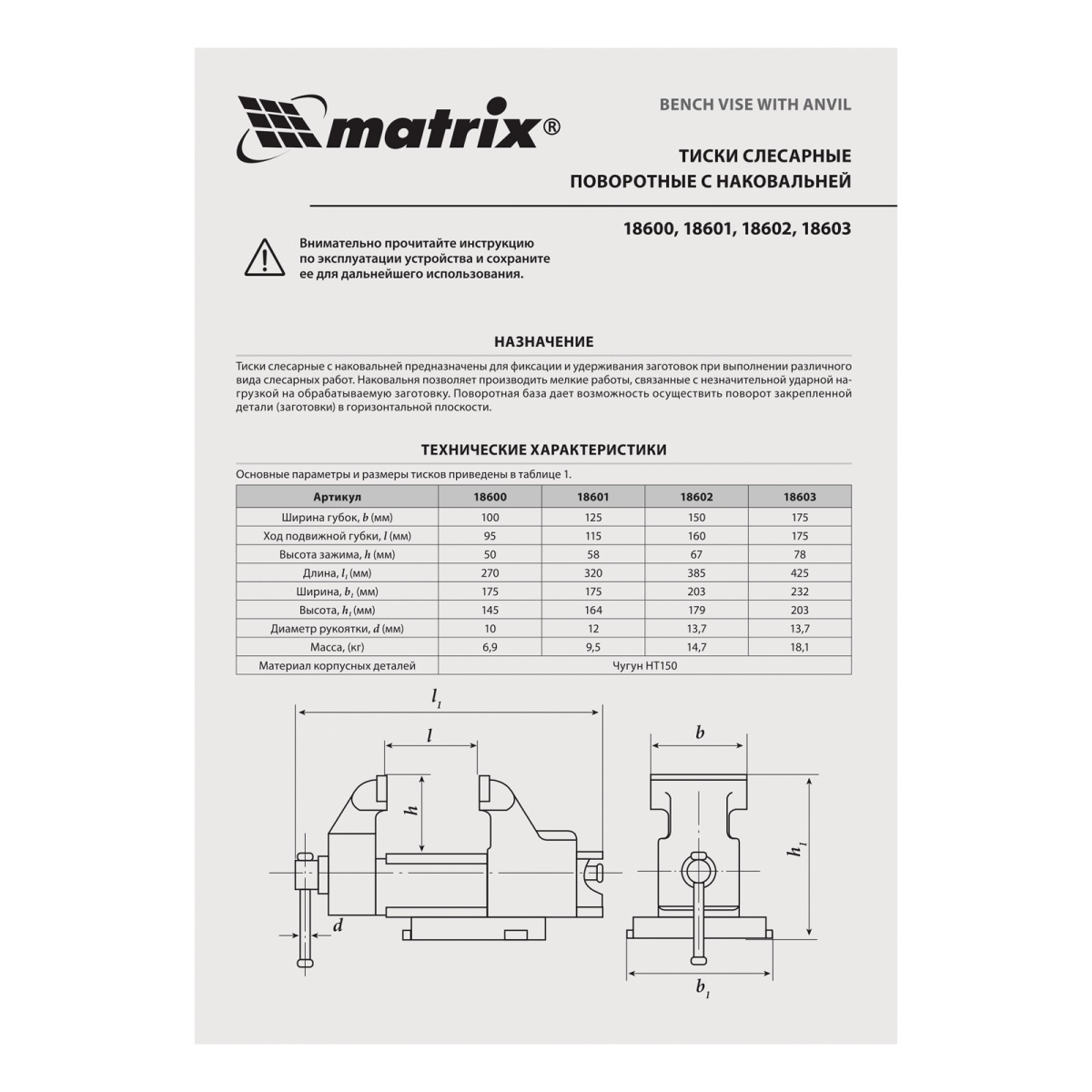 Купить Тиски слесарные, 100 мм, поворотные, с наковальней Matrix V7127 по лучшей цене с доставкой - интернет магазин №1 в России