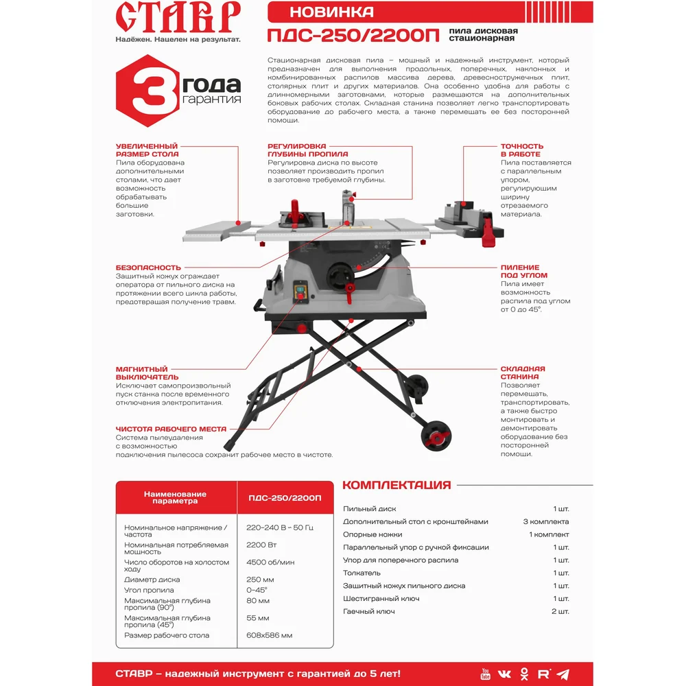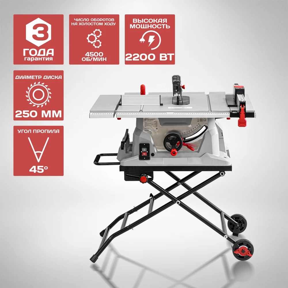 Дисковая стационарная пила Ставр Пдс-250/2200п 2200 вт, 4500 об/мин, диск 254мм, угол пропила 9031000136