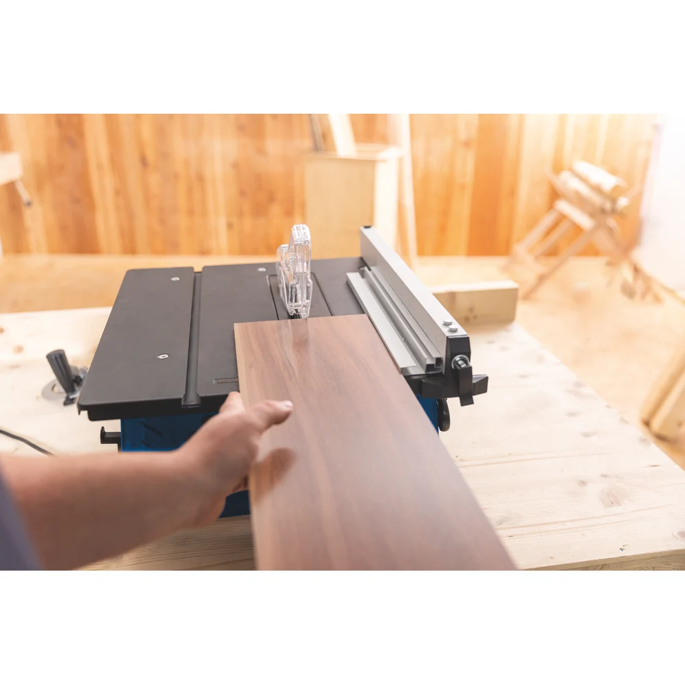 Комплектация 1x Защитный кожух пильного полотна; 1x Параллельный упор; 2x Гайка-звездочка; 2x Шайба; 2x Шестигранный болт; 1x Толкатель; 1x Поперечный калибр для резки; 1x Гаечный ключ с открытым зевом 22 мм; 1x Шестигранный ключ, 6 мм; Руководство по эксплуатации