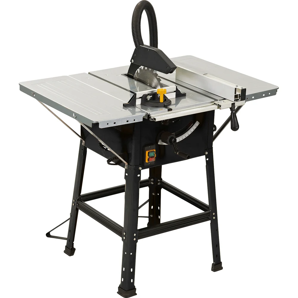 Комплектация Рабочий стол - 1 шт; Боковые удлинители стола - 2 шт; Опорная пружина - 4 шт; Длинная распорка - 2 шт; Короткая распорка - 2 шт; Ножки - 4 шт; Дополнительная опора - 2 шт; Защитный кожух - 1 шт; Шланг - 1 шт; Продольная направляющая - 1 шт; Рукоятка фиксации продольной направляющей - 1 шт; Угловой упор - 1 шт; Толкатель - 1 шт; Расклинивающий нож - 1 шт; Кривошип - 1 шт; Резиновые подставки на ножки - 1 шт; Крепежный комплект (винты – 39шт, шайбы – 46шт, гайки – 31шт - 1 шт; Руководство по эксплуатации - 1 шт
