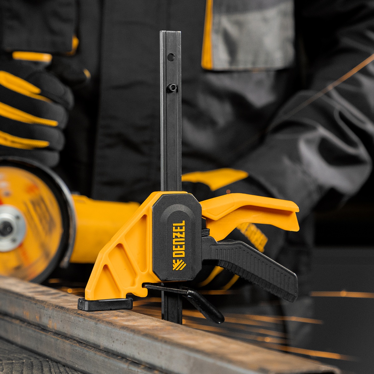 Наличие клапана для сброса давления Струбцина F-образная, быстрозажимная, 150 х 55 мм, усиленный нейлоновый корпус Denzel