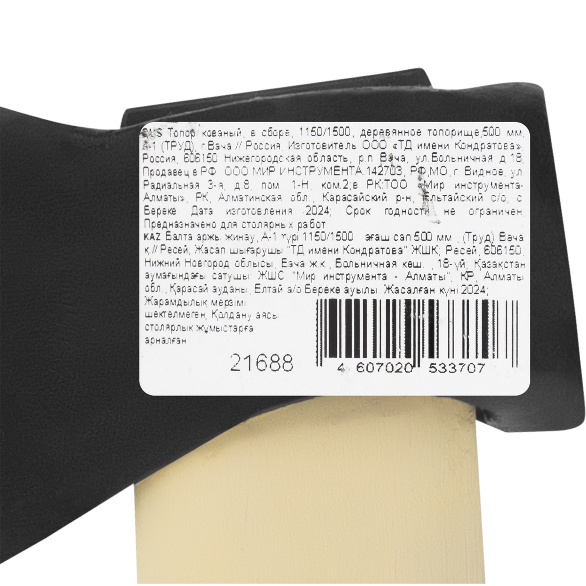Топор кованный, в сборе, 1150/1500 г, деревянное топорище, 500 мм, А-1
