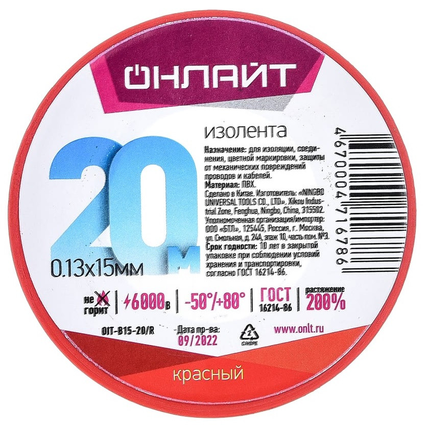 Купить Изолента ПВХ Онлайт OIT-B15-20/R красная 15 мм 20 м по лучшей цене с доставкой - интернет магазин №1 в России