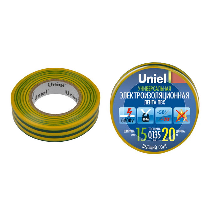 Купить Изолента ПВХ Uniel UIT-135P 15 мм желто-зеленая 20 м по лучшей цене с доставкой - интернет магазин №1 в России