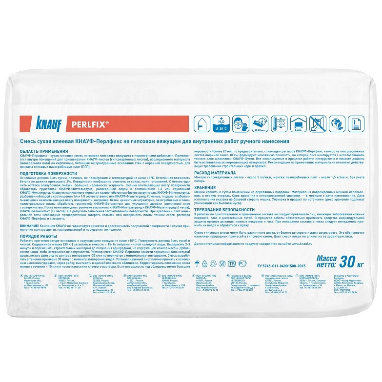 Купить Клей гипсовый монтажный Кнауф Перлфикс 30 кг по лучшей цене с доставкой - интернет магазин №1 в России