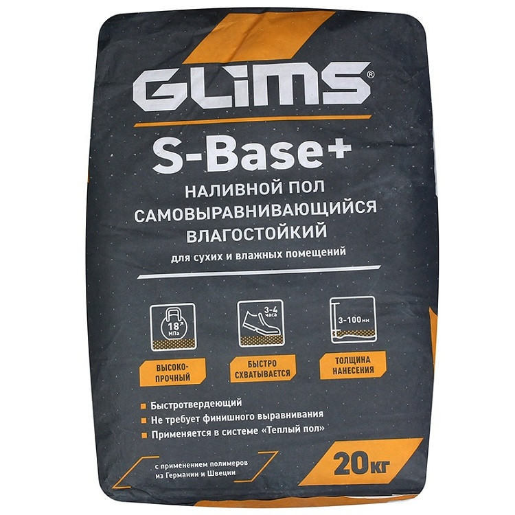 Купить Наливной пол Glims S-Base+ влагостойкий для базового выравнивания 20 кг по лучшей цене с доставкой - интернет магазин №1 в России