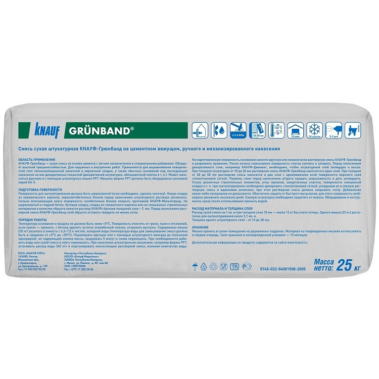 Купить Штукатурка цементная теплоизоляционная Knauf Грюнбанд серая 25 кг по лучшей цене с доставкой - интернет магазин №1 в России