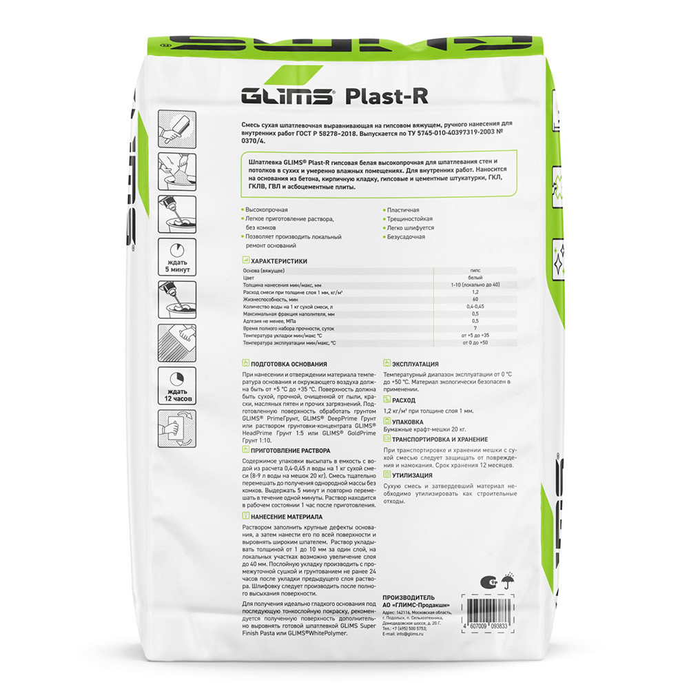 Купить Шпатлевка гипсовая Glims Plast-R высокопрочная 20 кг по лучшей цене с доставкой - интернет магазин №1 в России