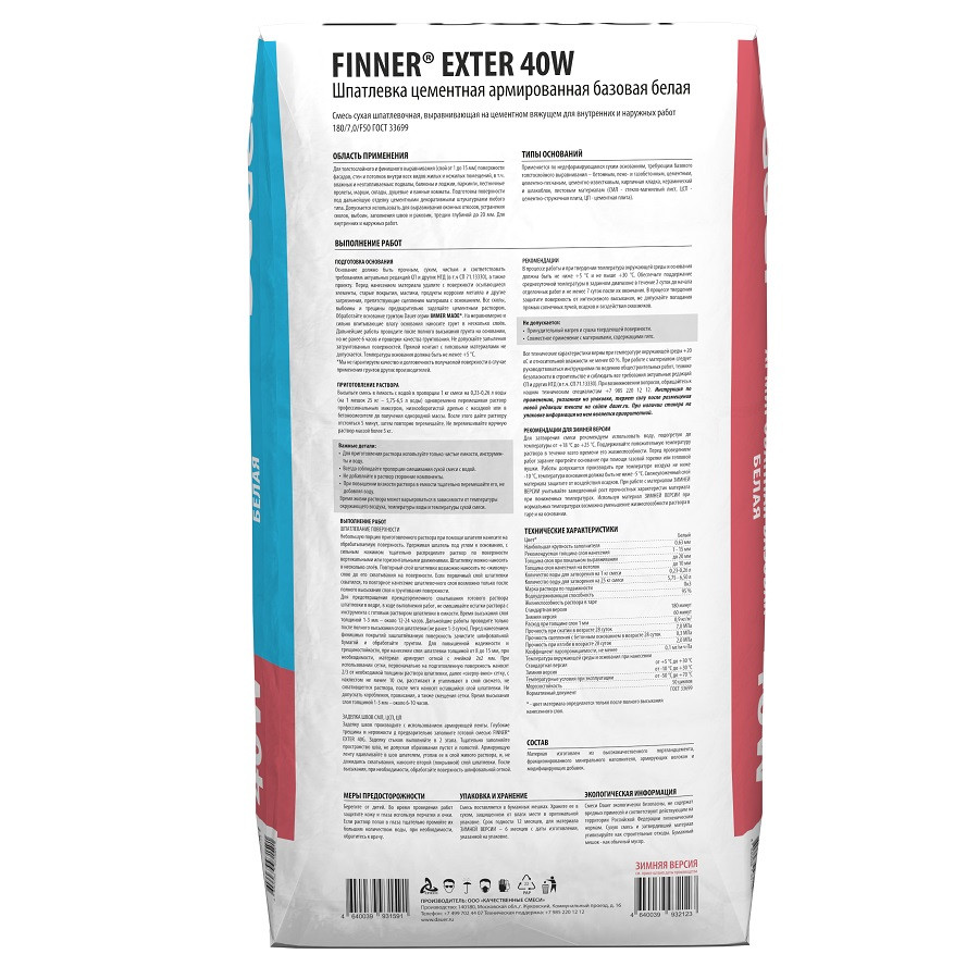 Купить Шпатлевка цементная базовая Dauer Finner Exter 40 W армированная белая 25 кг по лучшей цене с доставкой - интернет магазин №1 в России