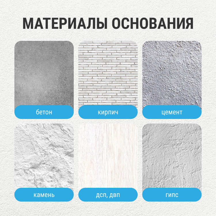 Материал основания Бетон, Кирпич, Камень, Гипс, ДСП, ДВП, Цемент