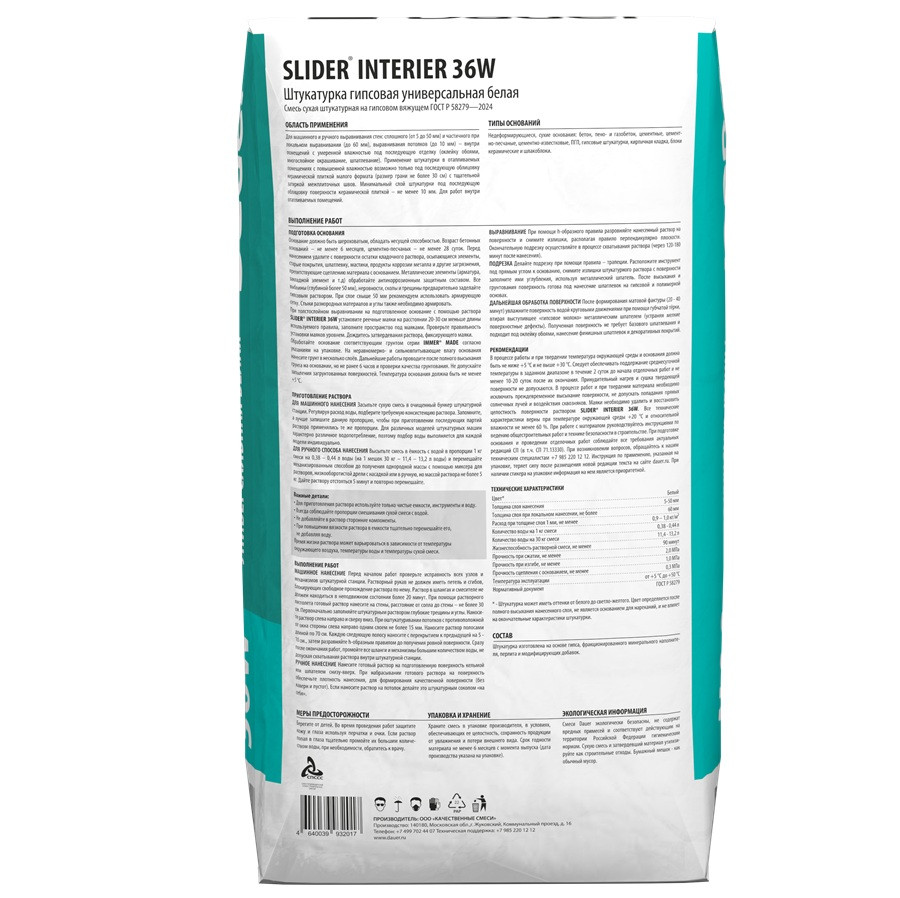Купить Штукатурка гипсовая Dauer Slider Interier 36 W белая универсальная 30 кг по лучшей цене с доставкой - интернет магазин №1 в России