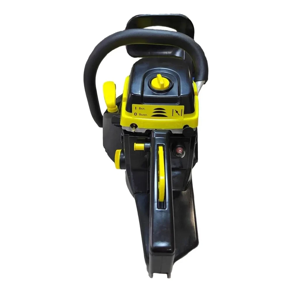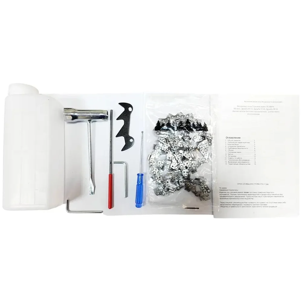 Комплектация Бензопила; Пильная шина; Пильная цепь; Защитный кожух шины; Свечной ключ; Отвертка; Шестигранный ключ; Зубчатый упор; Емкость для топливной смеси; Червячный привод масляного насоса; Шкив стартера; Трос стартера; Воздушный фильтр; Топливный фильтр; Инструкция по эксплуатации; Упаковочная коробка