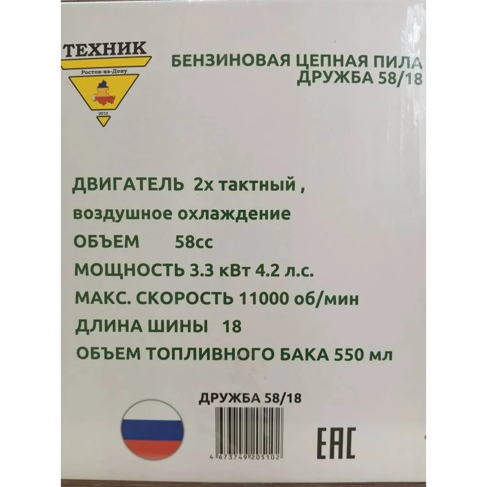 Купить Бензопила ТД Техник ТЕХНИК ДРУЖБА 58/18 18", 58 куб.см, легкий старт, 3.3 кВт, 4.2 л.с., 71 по лучшей цене с доставкой - интернет магазин №1 в России