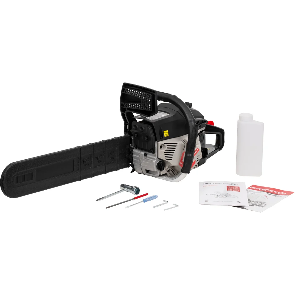 Комплектация Пила бензомоторная цепная; Шина 1шт; Цепь 1 шт; Чехол пильного аппарата; Ключ монтажный комбинированный; Напильник; Отвертка; Ключ шестигранный, (S3; S4), 2шт; Гайка с буртиком М8 2 шт; Винт М5х14, 2шт; Упор зубчатый; Гарантийный талон; Упаковка; Руководство по эксплуатации и безопасности