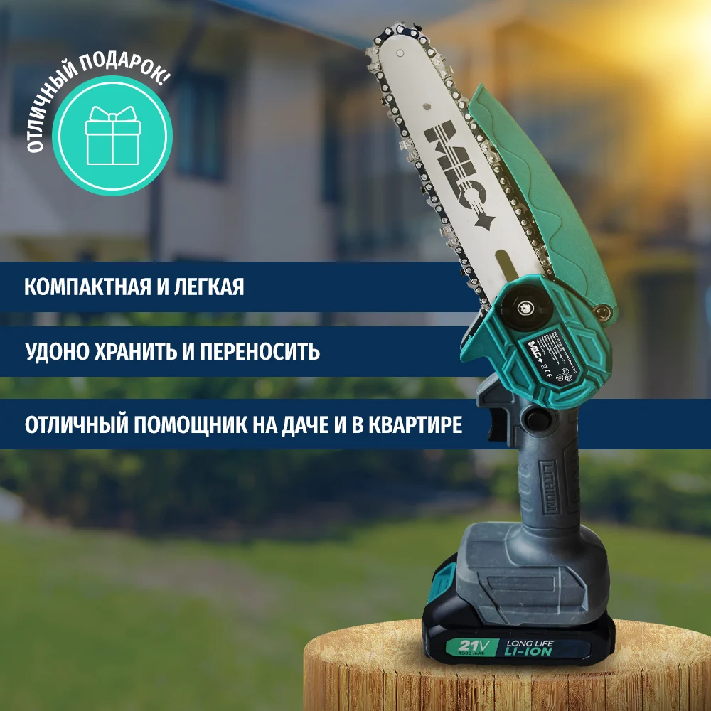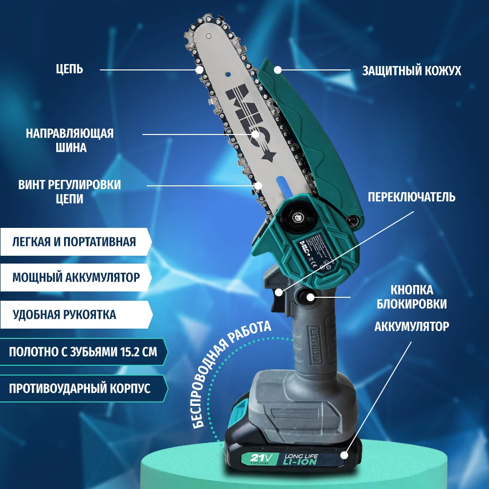 Аккумуляторная цепная пила MLC шина 15.2 см,21В, АКБ Li-ion 1.3 А*ч YH-DZ-102