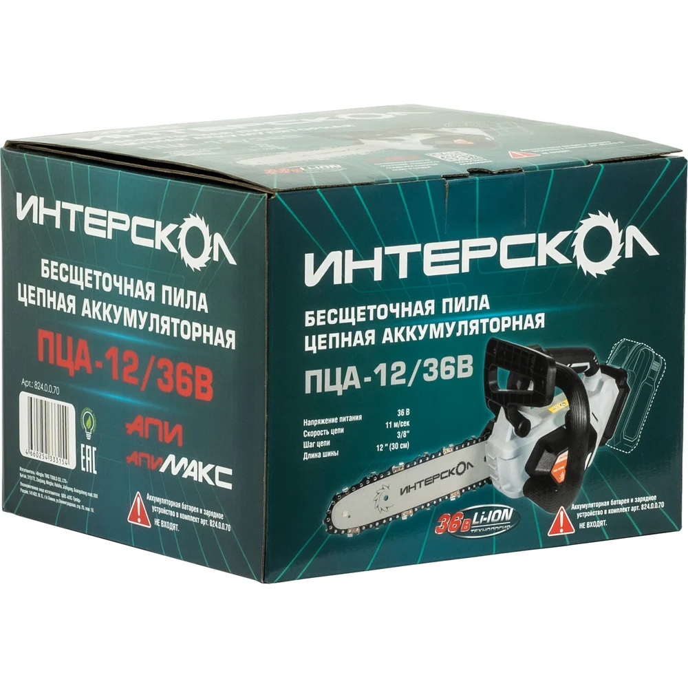 Купить Бесщеточная аккумуляторная цепная пила Интерскол ПЦА-12/36В Li-ion, АПИ (картон, без аккум. и ЗУ) 824.0.0.70 по лучшей цене с доставкой - интернет магазин №1 в России