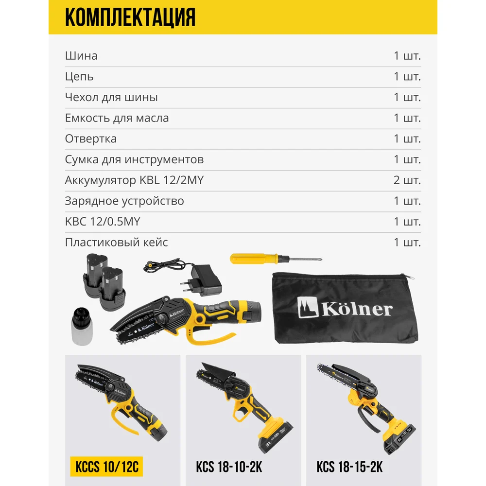 Комплектация Руководство по эксплуатации; Шина 1 шт; Цепь 1 шт; Чехол для шины; Ёмкость для масла; Отвёртка; Сумка для инструментов; Аккумулятор KBL 12/2MY 2 шт; Зарядное устройство KBC 12/0.5MY; Пластиковый кейс