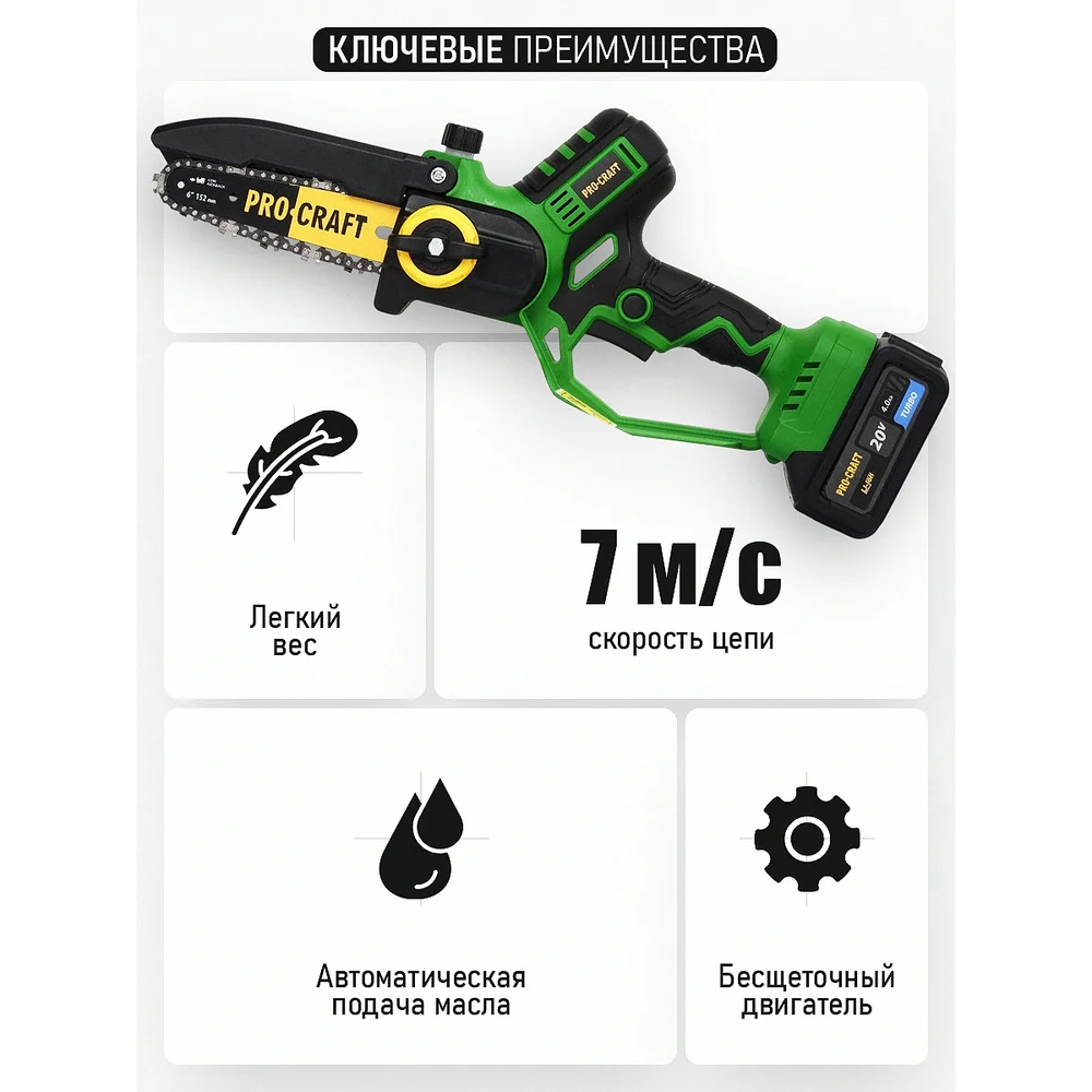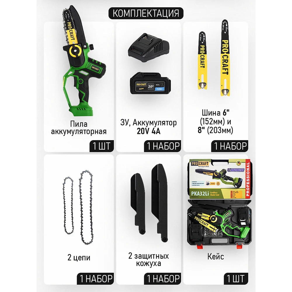 Пила цепная аккумуляторная PROCRAFT 20В 6'/8' 2 Шины+ 2 Цепи, АКБ 4Ач+ЗУ PKA32Li